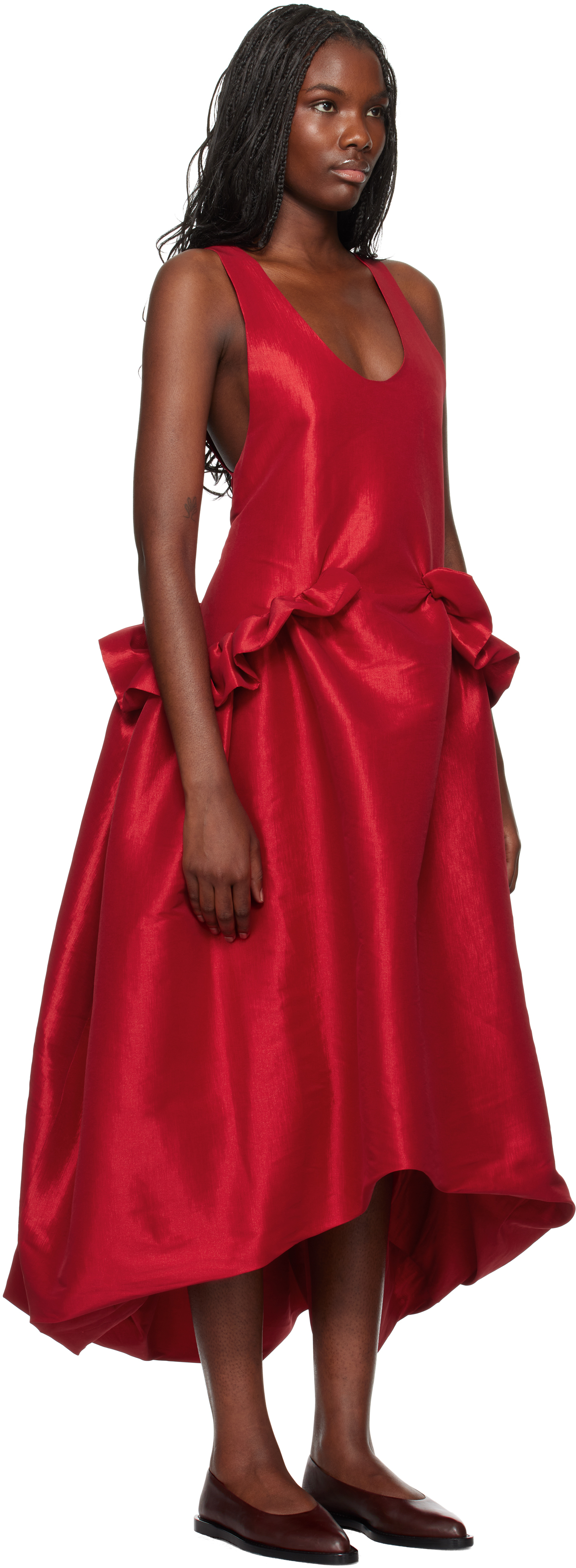 Эксклюзивное красное платье Ramya Midi от SSENSE. Платье-миди из тафты с добавлением полиэстера и эластичной ткани. · Овальный вырез горловины · Сборка и оборки на талии · Низкая спинка · Длинный подол с пузырьками · Полностью эластичная атласная подкладка. Доступно эксклюзивно в SSENSE. Цвет поставщика: красный. Основная часть: 65% полиэстер, 30% нейлон, 5% эластан. Подкладка: 97% полиэстер, 3% эластан. Сделано в Колумбии.