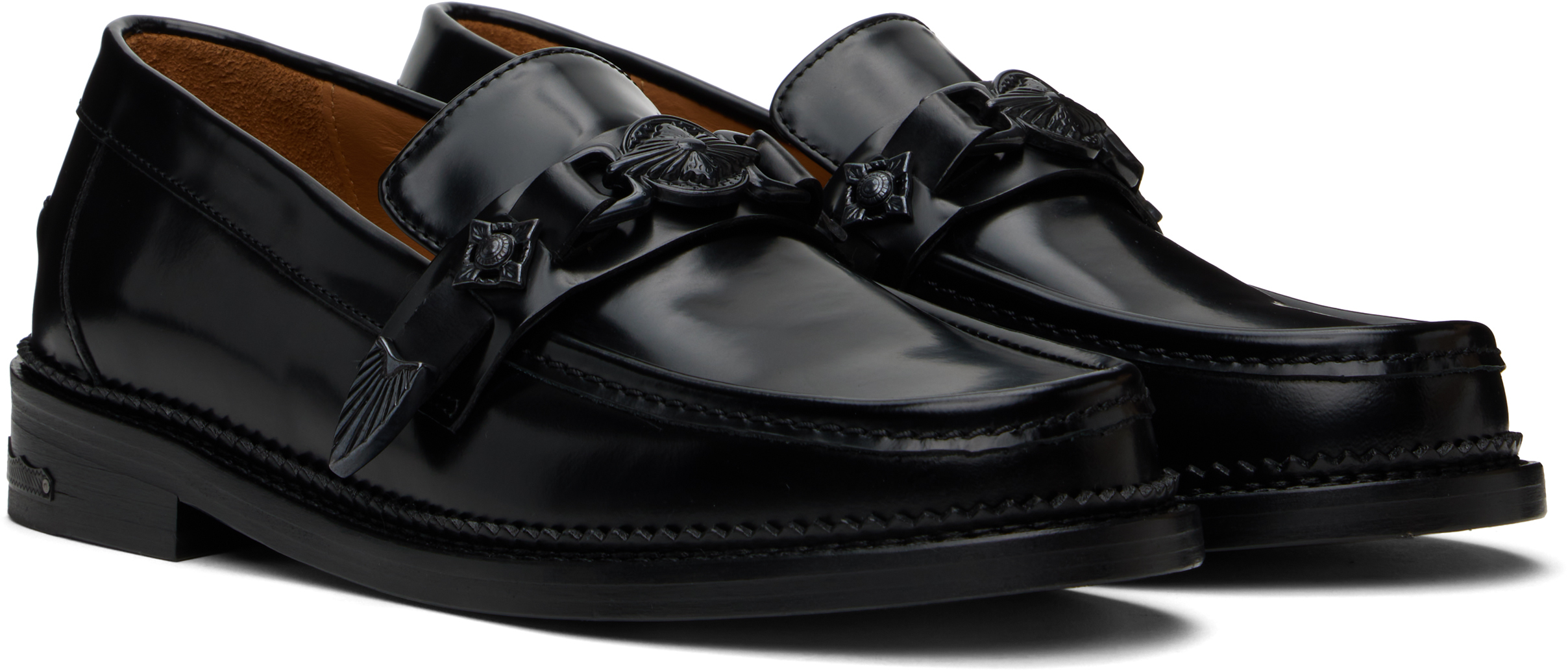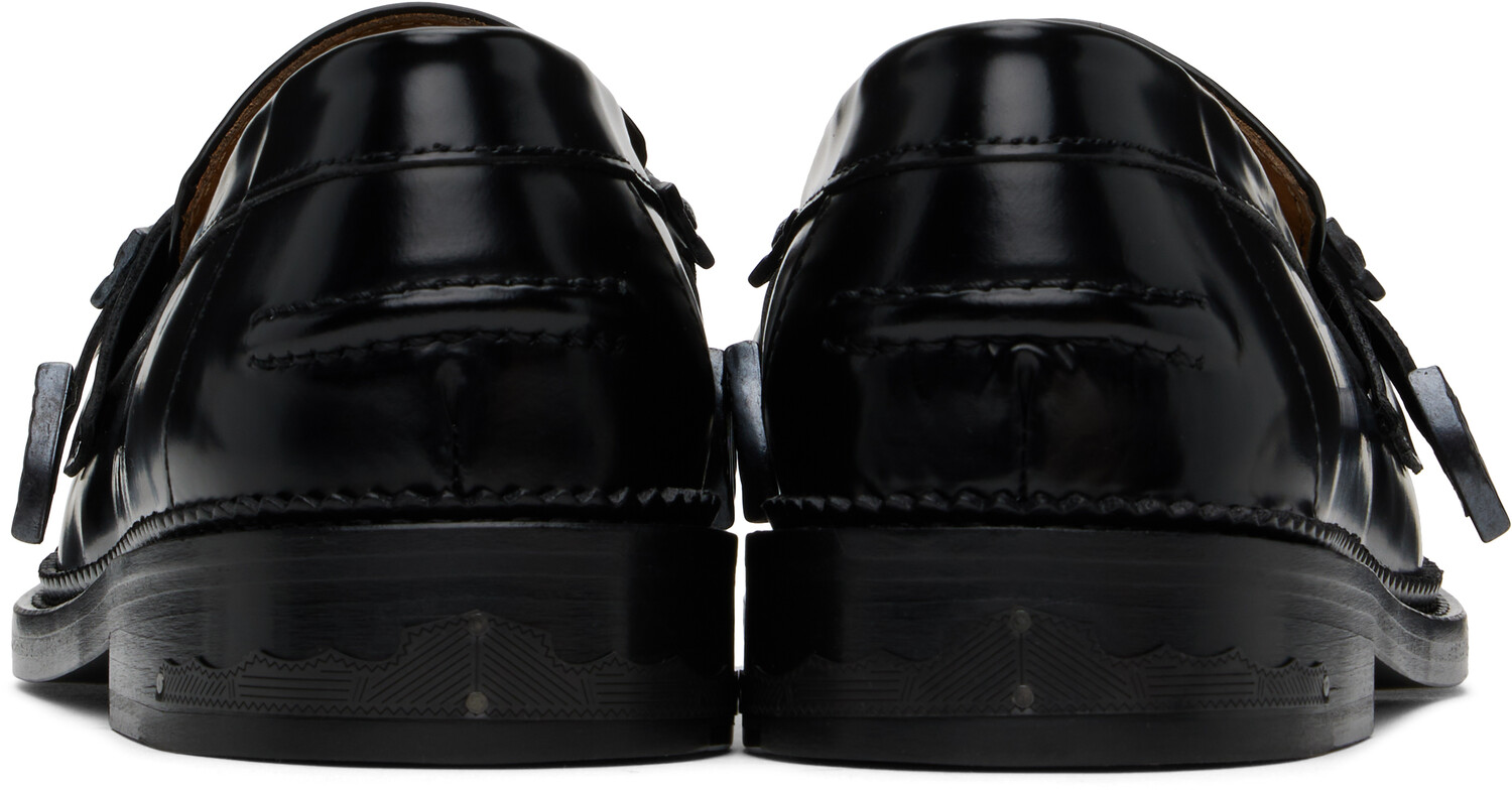 Эксклюзивные черные лоферы SSENSE. Лоферы из полированной кожи черного цвета.· Мок-носок· Ремешок на союзке· Фирменная графическая фурнитура на союзке и пятке· Защипнутый шов на заднике· Зубчатая отделка по ранту· Подкладка из замши и полированной кожи· Наборный кожаный каблук· Кожаная подошва с резиновым вкраплением· Фурнитура цвета оружейной стали· Каблук: H1" Доступно эксклюзивно в SSENSE. Цвет поставщика: черный/оружейная сталь Верх: кожа. Подошва: кожа, резина. Сделано в Португалии.