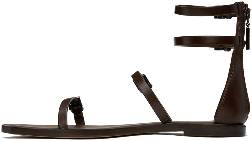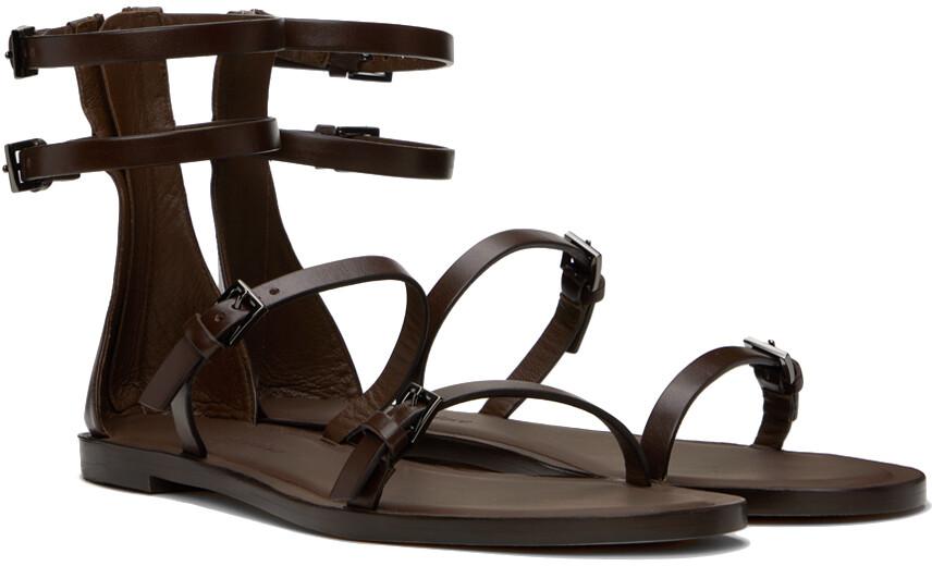 Коричневые сандалии Evegflat. Сандалии из полированной кожи коричневого цвета. · Ремешки с пряжками по всей длине. · Открытый носок. · Застежка-молния на заднике. · Мягкая кожаная стелька с тиснением логотипа. · Наборная кожаная подошва. · Кожаная подошва с резиновым напылением. Цвет поставщика: темно-коричневый. Верх: кожа. Подошва: кожа, резина. Сделано в Италии.