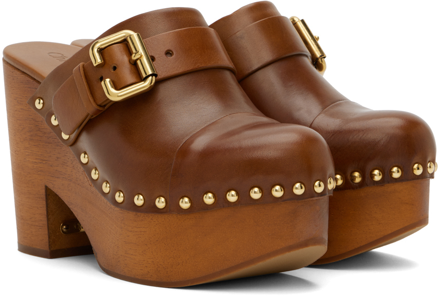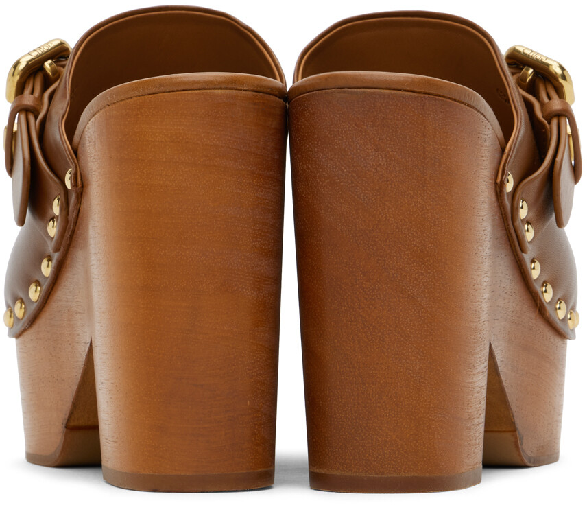 Коричневые сабо Jeannette Wedge. Сабо из полированной кожи коричневого цвета.· Ремешок с пряжкой на мыске.· Подкладка из полированной телячьей кожи.· Тисненый логотип на мягкой стельке из телячьей кожи.· Заклепки на ранте.· Каблук из африканского падуака.· Пластинка с логотипом на пятке.· Промежуточная подошва из африканского падуака.· Текстурированная подошва из полиуретана.· Платформа: H2"· Каблук: H4.5" Цвет поставщика: рыжевато-коричневый Верх: кожа. Подошва: африканский падуак, термопластичный полиуретан. Сделано в Италии.