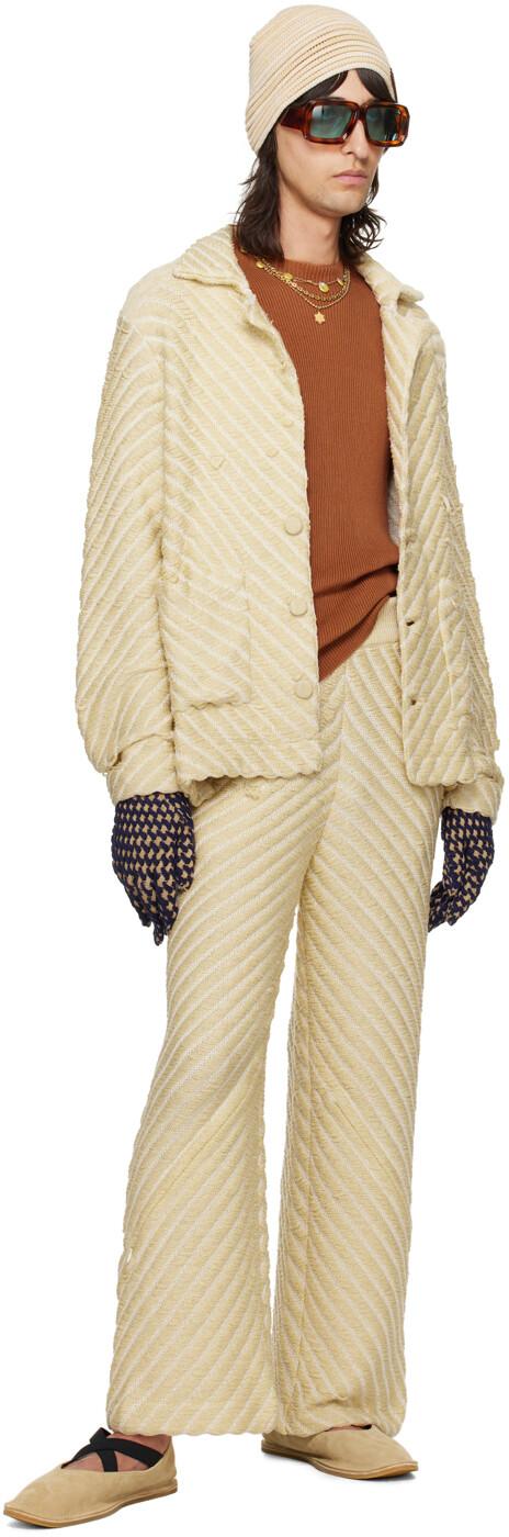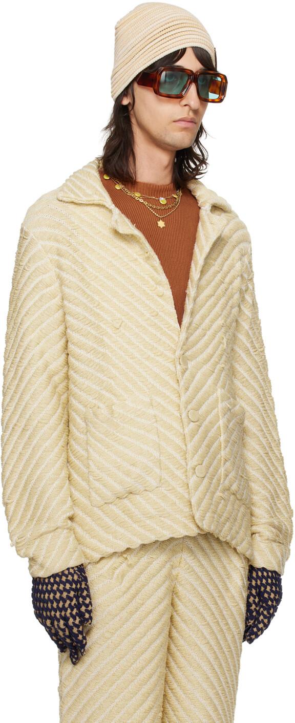 Эксклюзивная бежевая куртка SSENSE. Куртка из искусственного шелка ручной вязки. Лестничный узор и шеврон по всей длине.· Заостренный лацкан· Застежка на пуговицы· Накладные карманы· Вентилируемые наружные швы· Спущенные плечи· Флажок с логотипом на подоле сзадиДоступно эксклюзивно в SSENSE.Цвет поставщика: овсянка, 100% искусственный шелк. Сделано в Индонезии.