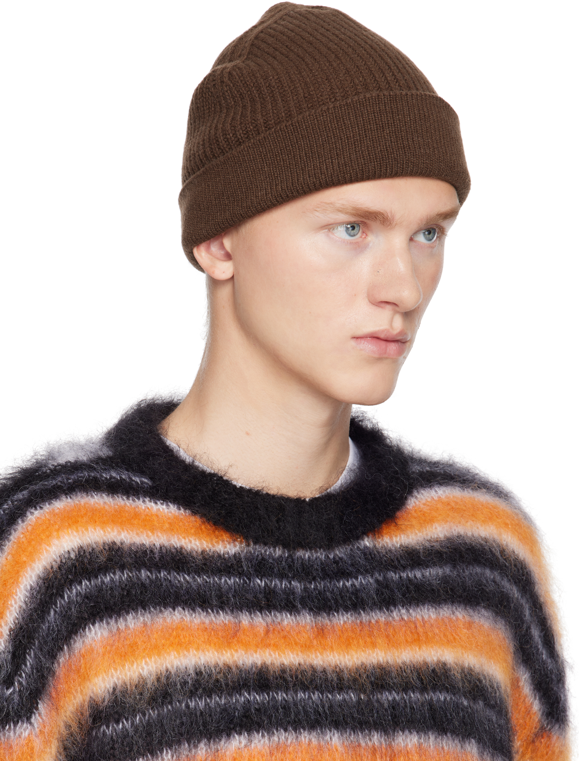 Brown Mending Logo Beanie. Шапка-бини из смеси натуральной шерсти и кашемира коричневого цвета, вязка в рубчик.· Логотип вышит на боковом шве.· Завернутые поля. Цвет поставщика: Moca 70% натуральной шерсти, 30% кашемира. Сделано в Италии.