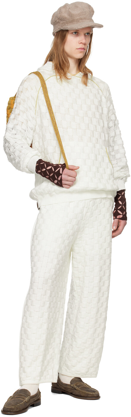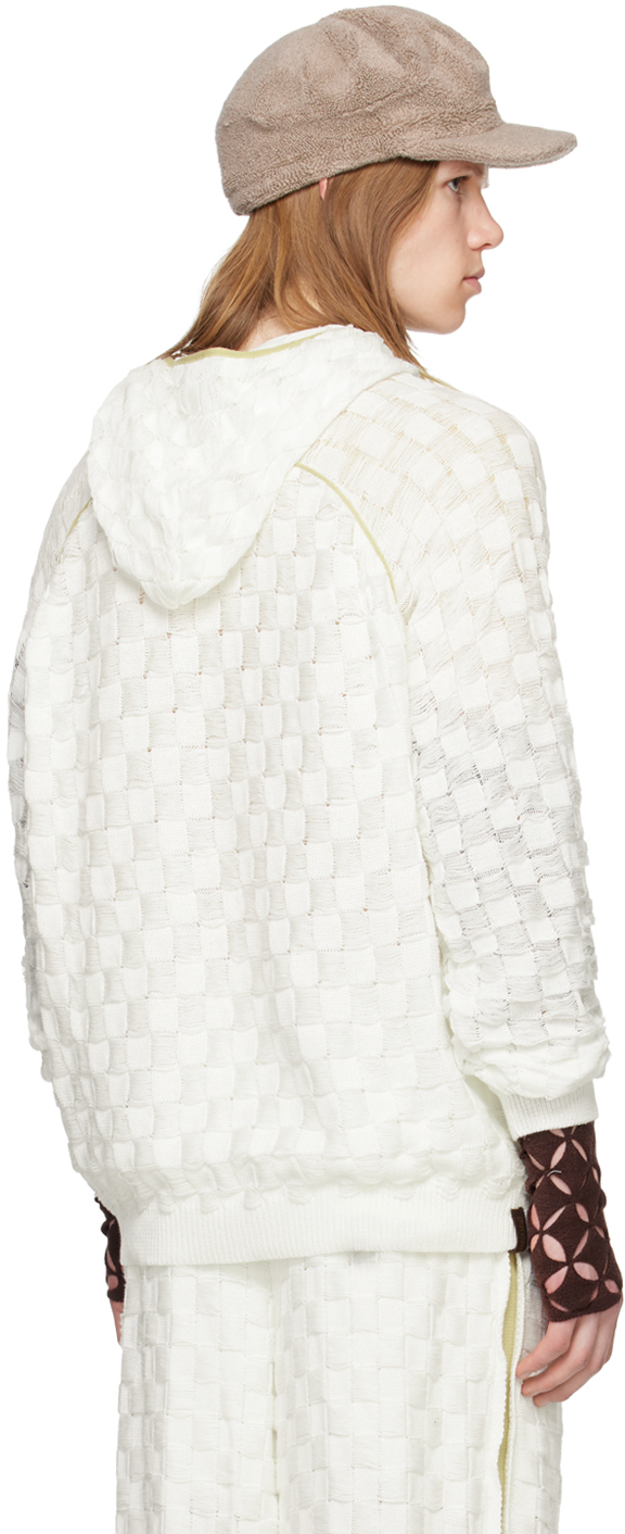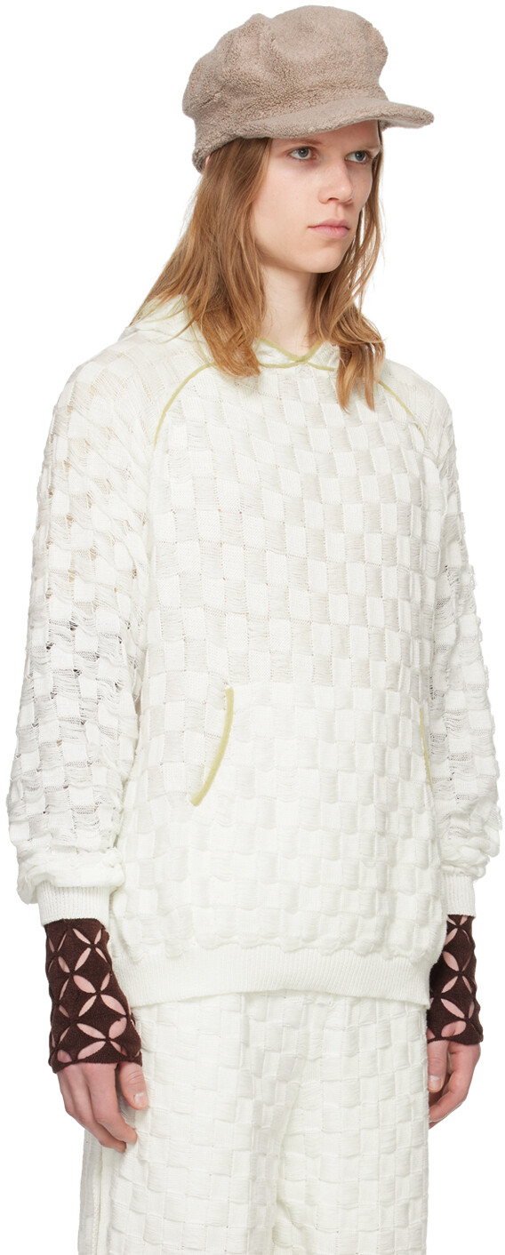 Эксклюзивная белая толстовка с капюшоном Chess от SSENSE. Хлопковая толстовка с капюшоном, плетеная в корзинку. Лестничный узор и узор в клетку по всей длине. · Кант спереди и сзади. · Карман-кенгуру. · Трикотажные манжеты и кромка в рубчик. · Рукава реглан. · Логотип на подоле сзади. Доступно эксклюзивно в SSENSE. Цвет поставщика: мел, 100% хлопок. Сделано в Индонезии.