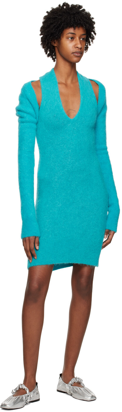 Мини-платье с вырезом синего цвета. Платье из трикотажной эластичной смеси альпаки и начеса. · Круглый вырез, подол и проймы рукавов связаны в рубчик. · Застежка на пуговицы и вырез-замочная скважина на воротнике сзади. Цвет поставщика: Blue curacao 52% альпака, 32% полиамид, 13% натуральная шерсть, 3% эластан. Сделано в Молдове.