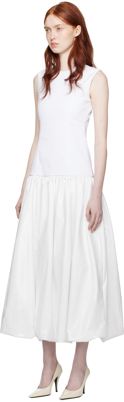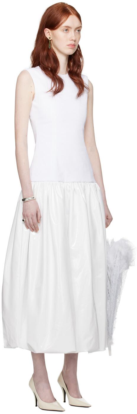 Эксклюзивное белое платье макси Audrey от SSENSE. Платье из эластичного денима и трикотажа из полиэстера с покрытием. · Круглый вырез горловины. · Швы «принцесса» спереди и сзади. · Сборка на заниженной талии. · Структурированный подол с пузырьками. · Потайная застежка-молния сзади. · Подкладка из ткани Оксфорд. Часть эксклюзивной свадебной капсулы SSENSE. Цвет поставщика: белый. Тело 1: 97% хлопок, 3% эластан. Тело 2: 100% полиэстер. Подкладка: 65% полиэстер, 35% хлопок. Сделано в Литве.