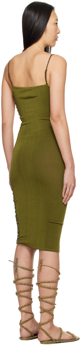 Эксклюзивное платье-миди цвета хаки Jigsaw от SSENSE. Платье из эластичного джерси. · Квадратный вырез. · Плетеная отделка по боковому шву. · Регулируемые тонкие бретельки. Доступно эксклюзивно в SSENSE. Цвет поставщика: милитари 90% вискозы, 10% эластана. Сделано в Индонезии.