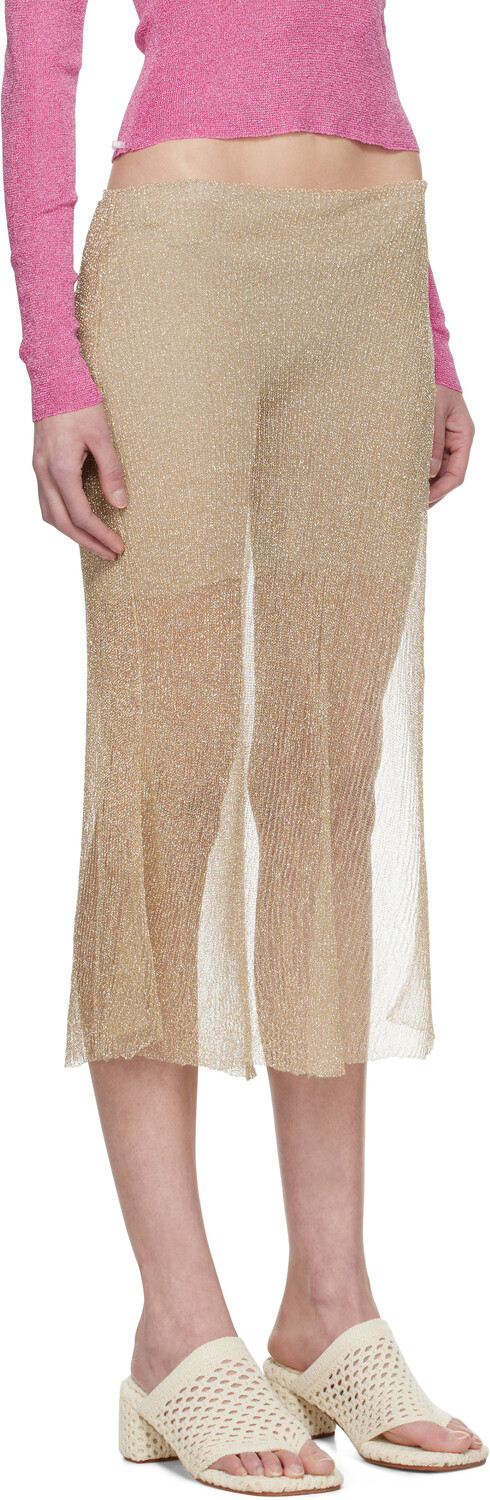 Юбка миди с запахом Gold. Юбка миди из прозрачного трикотажного эластичного вискозного шелка. Конструкция с запахом. Эластичный пояс. Разрез по боковому шву. Интегрированная трикотажная подкладка в стиле шорт. Логотип на талии сзади. Цвет поставщика: отбеливатель 90% вискозы, 10% эластана. Сделано в Индонезии.