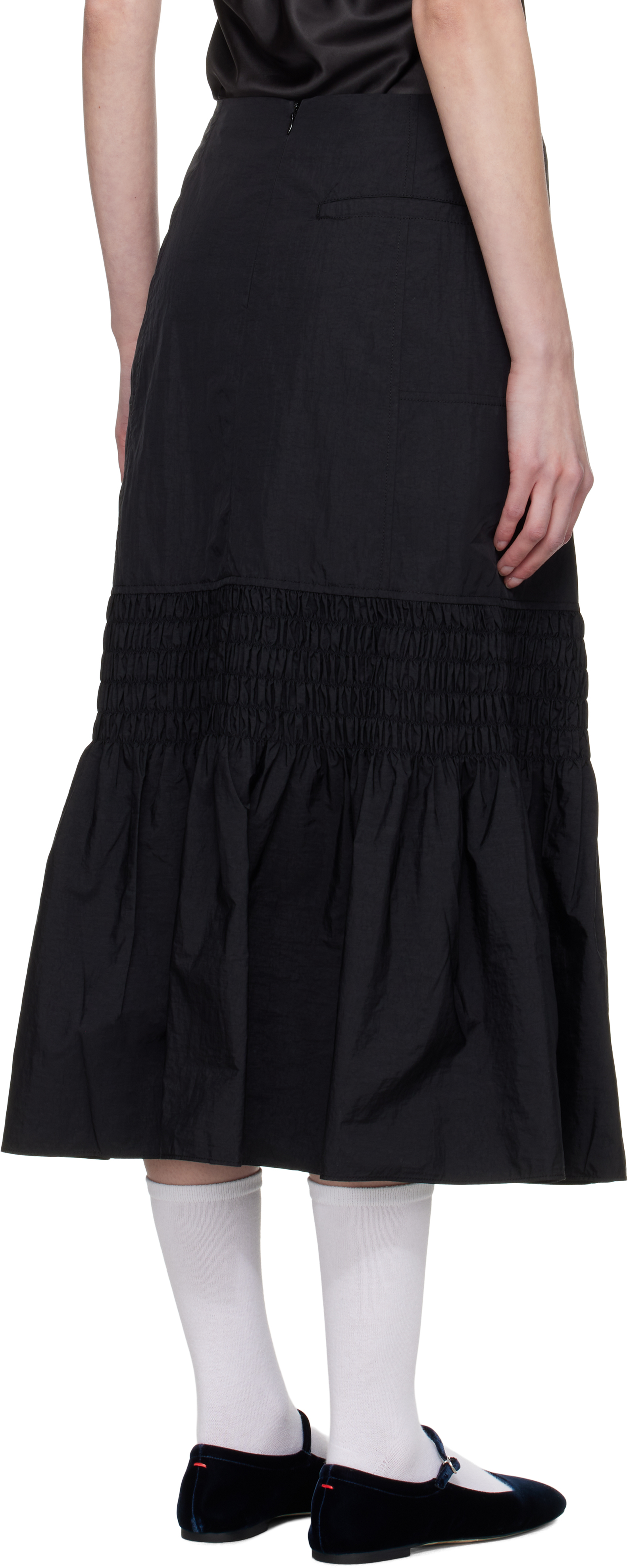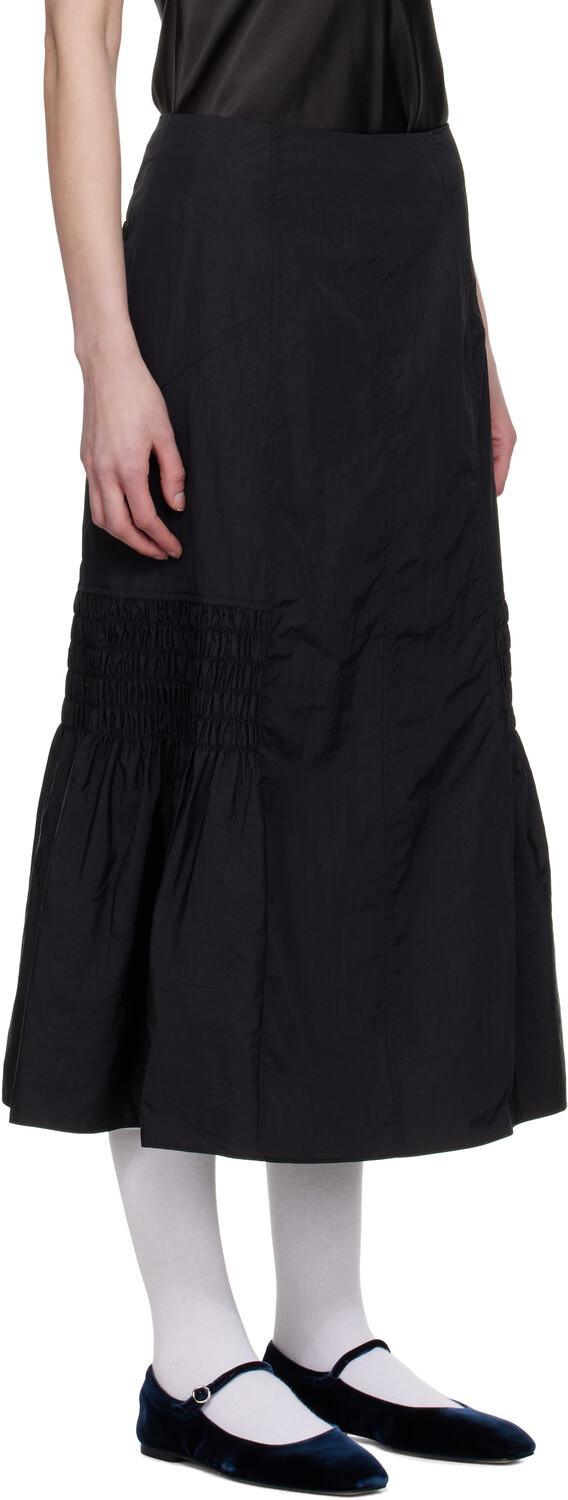 Черная юбка-русалка со сборками. Юбка-миди из жатой нейлоновой тафты.· Один карман.· Вышитый логотип спереди.· Расклешенный подол.· Сборки по бокам и сзади.· Застежка-молния сзади.· Частичная атласная подкладка. Цвет поставщика: черный, 100% нейлон. Сделано в Южной Корее.