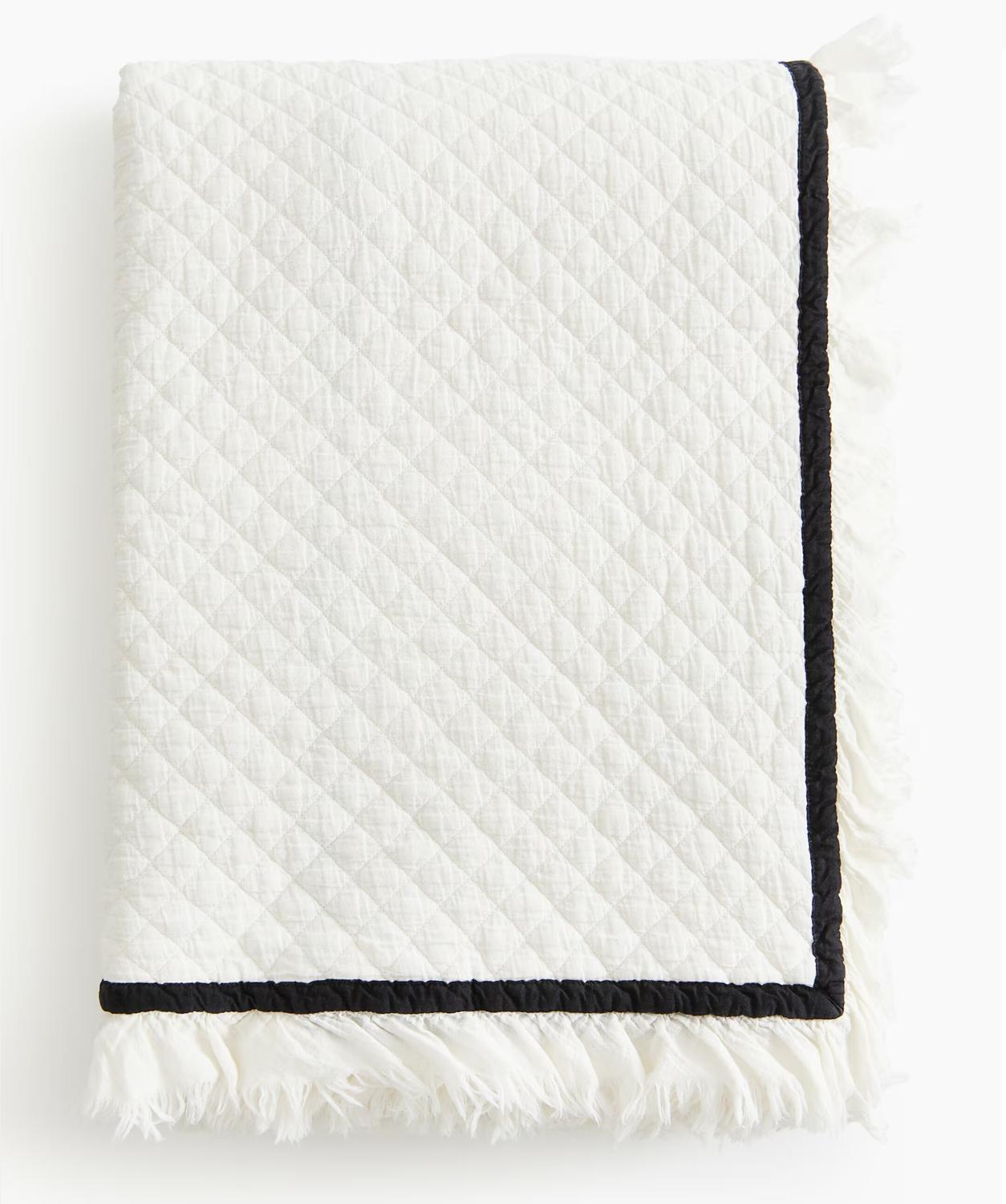 Стеганое покрывало для односпальных кроватей из мягкой хлопчатобумажной ткани с легкой набивкой. Покрывало имеет окантовку контрастного цвета и потертый подол, придающий ему элегантность и деревенский колорит.