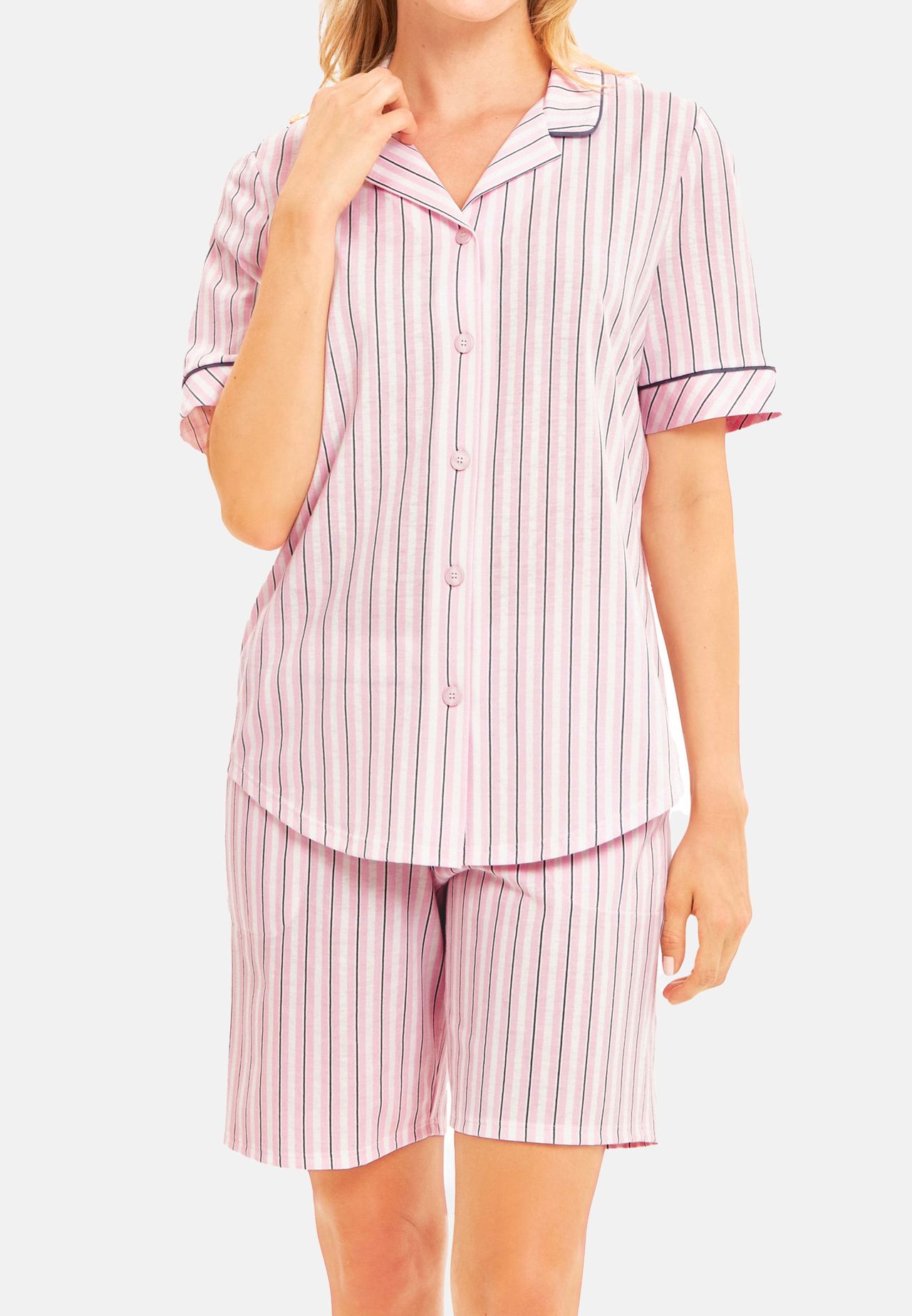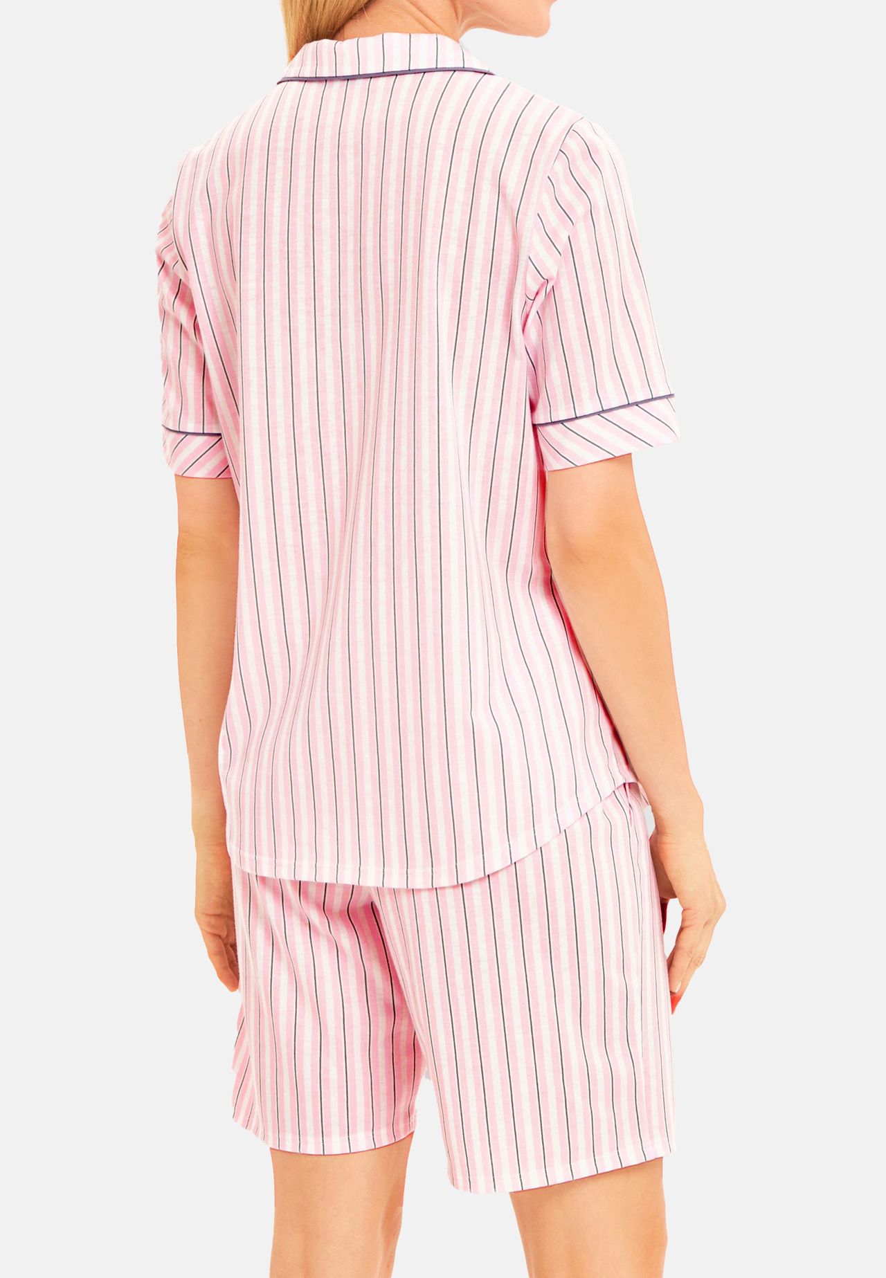 Эти короткие пижамы впечатляют своим мужским верхом, который застегивается на все пуговицы и имеет небольшой воротник с лацканами. Кант по краю воротника и рукавов придает модели повседневный вид, а слегка закругленный низ дополняет образ. Брюки имеют широкий мягкий эластичный пояс, тонкую окантовку пояса и практичные боковые карманы, обеспечивающие дополнительный комфорт.