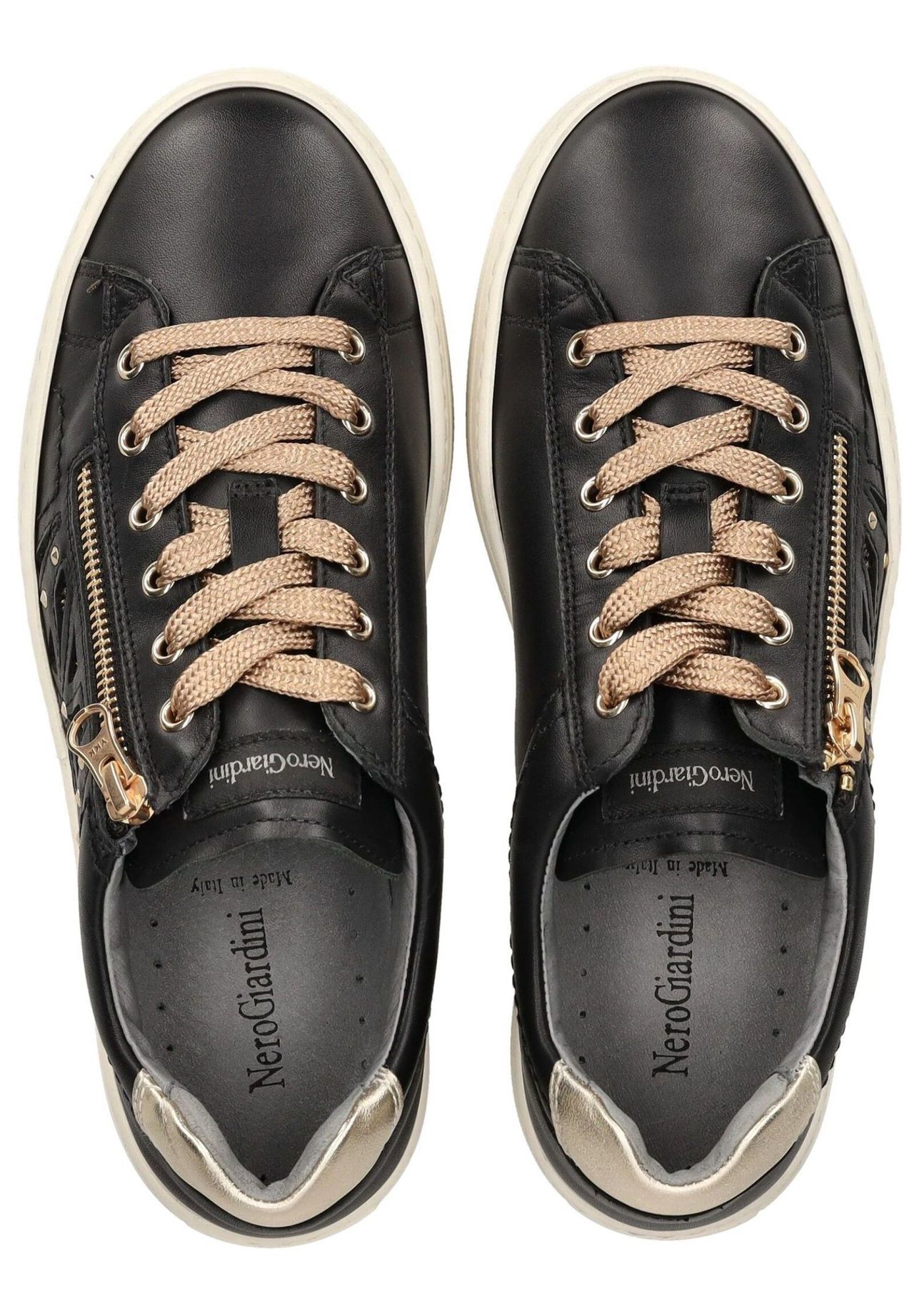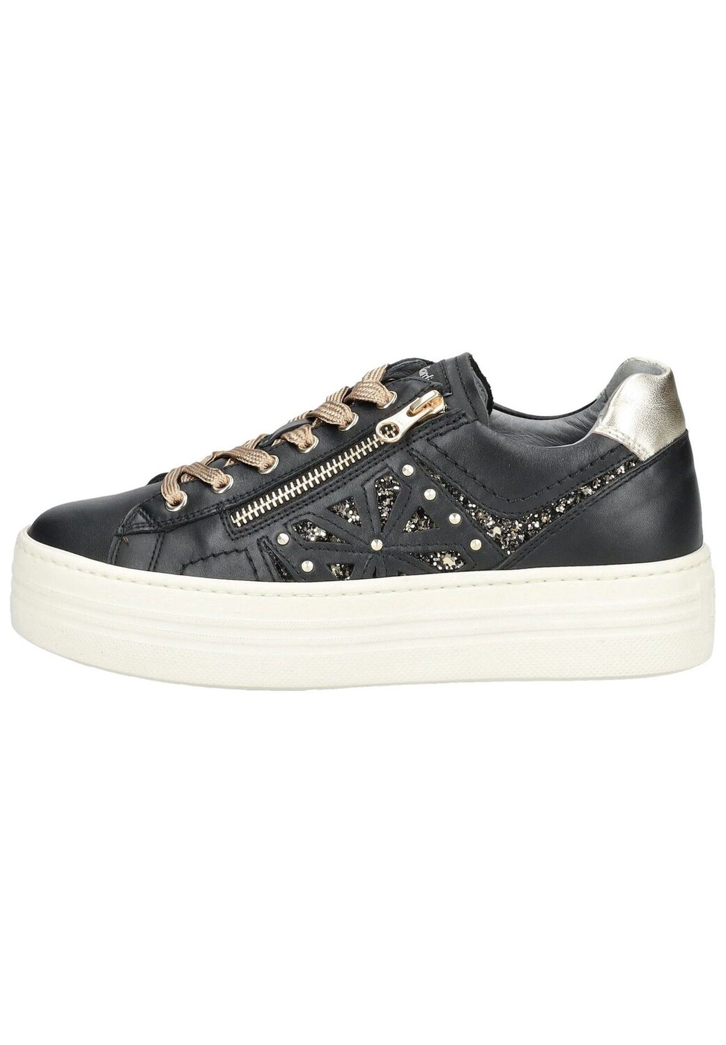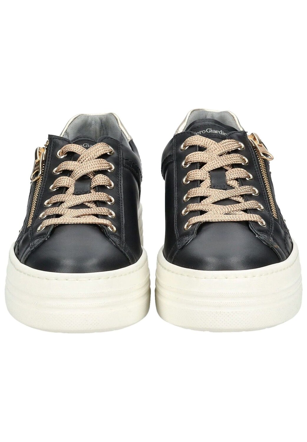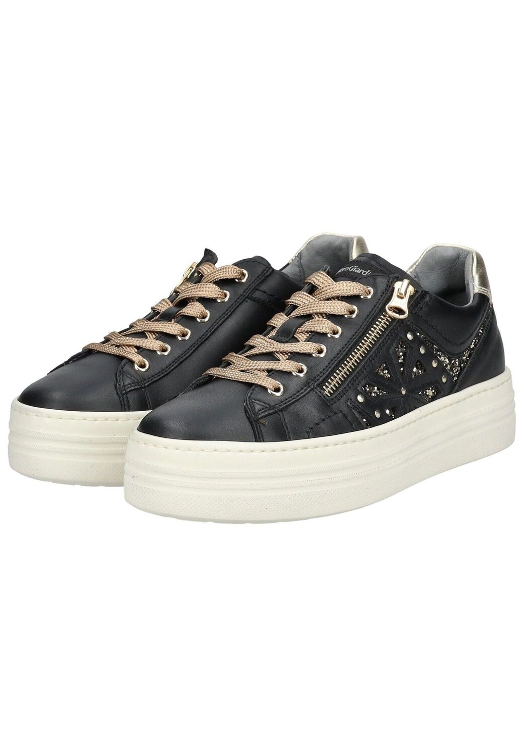 Эти модные кроссовки на платформе из высококачественной кожи и текстиля от Nero Giardini имеют элегантный дизайн. Эта довольно простая обувь станет идеальным дополнением ко многим нарядам благодаря блестящим бликам. Благодаря шнуровке и дополнительной молнии кроссовки идеально адаптируются по ноге. Мягкая съемная стелька гарантирует высокий комфорт при ношении в течение всего дня. Эти кроссовки просто незаменимы для каждого любителя обуви!
