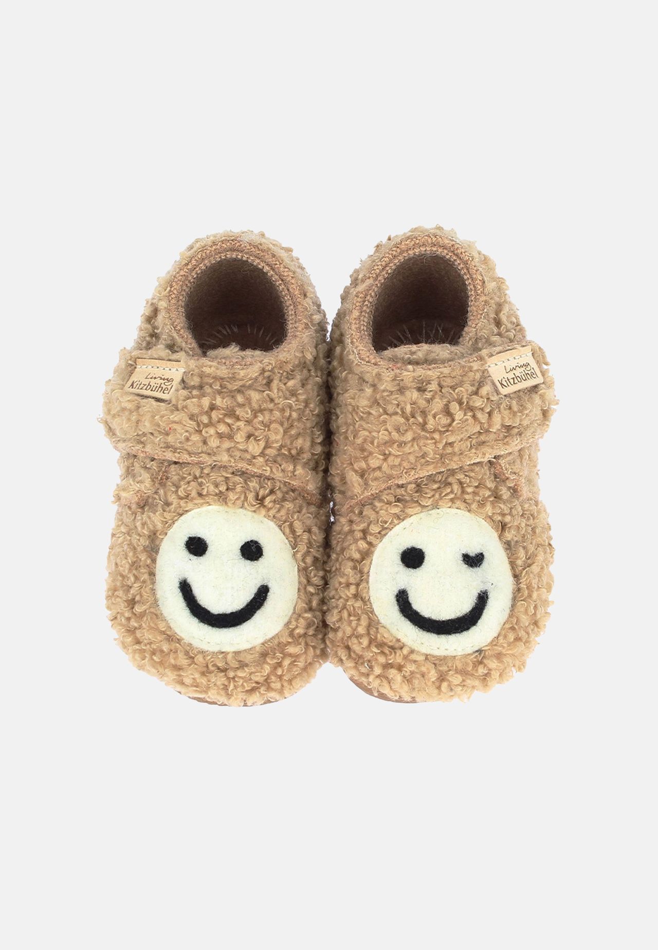 Эти тапочки с веселой аппликацией в виде смайлика созданы для того, чтобы каждый день начинать с радости. Дополнительная информация о товаре: Пушистый плюш из синтетического волокна, стелька из натуральной шерсти для максимального комфорта. Пришитая вручную аппликация и голенище длиной до щиколотки идеально подходят для начинающих бегунов и малышей. Легко надевать и снимать благодаря широко открывающейся застежке-липучке. Нескользящая, устойчивая к истиранию и гибкая подошва.