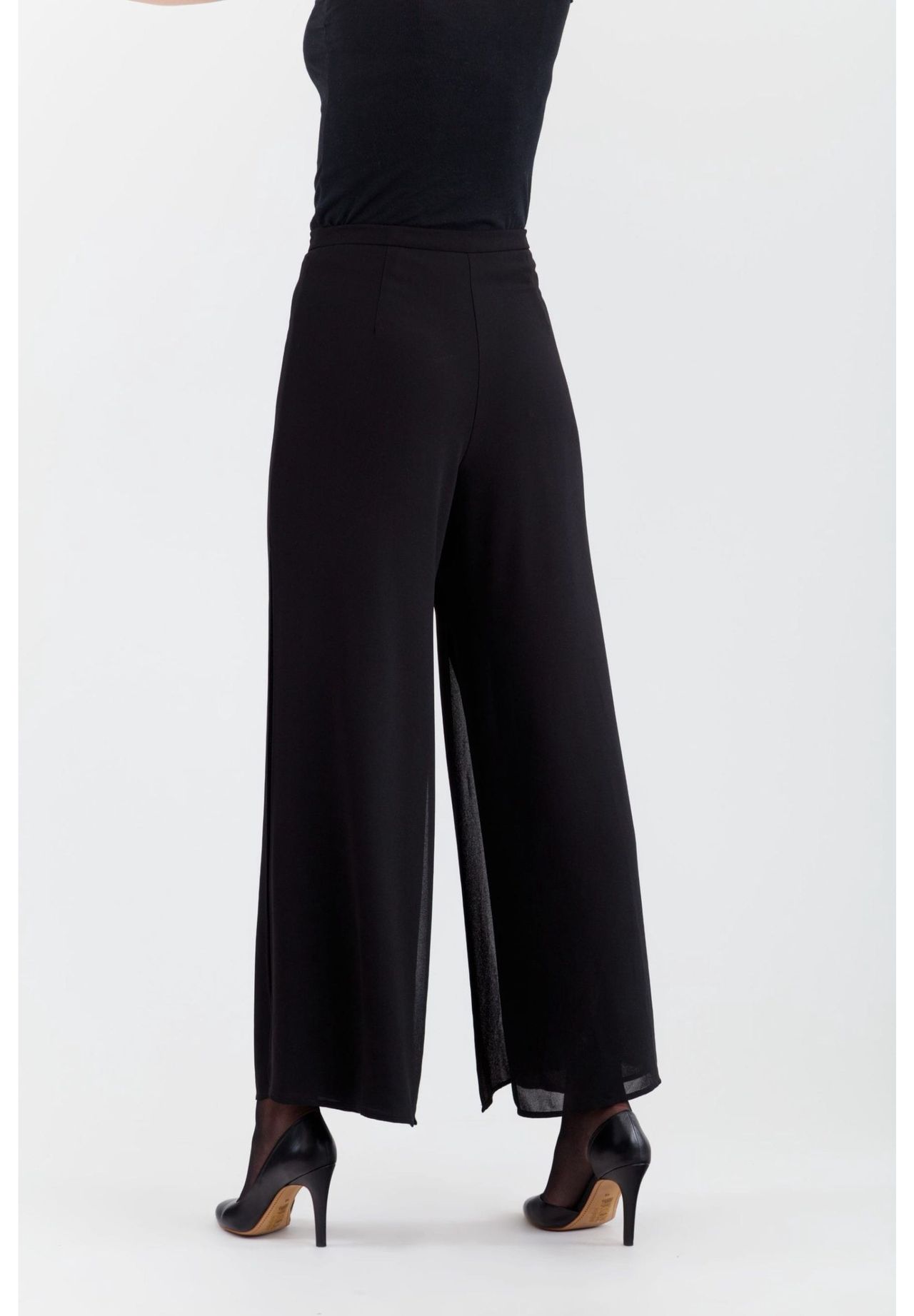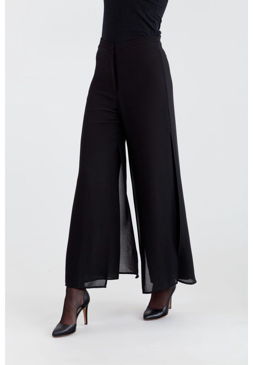 Обработка в два слоя. Боковые разрезы. На поясе кнопка-крючок, молния. Длина штанины: 104 см без пояса для 40-го размера. Внутренняя длина штанины: 78 см. 100% полиэстер. Инструкции по стирке: щадящий режим при 30°C, не сушить в стиральной машине, сухая чистка в обычном режиме, не отбеливать, не гладить в горячей воде.