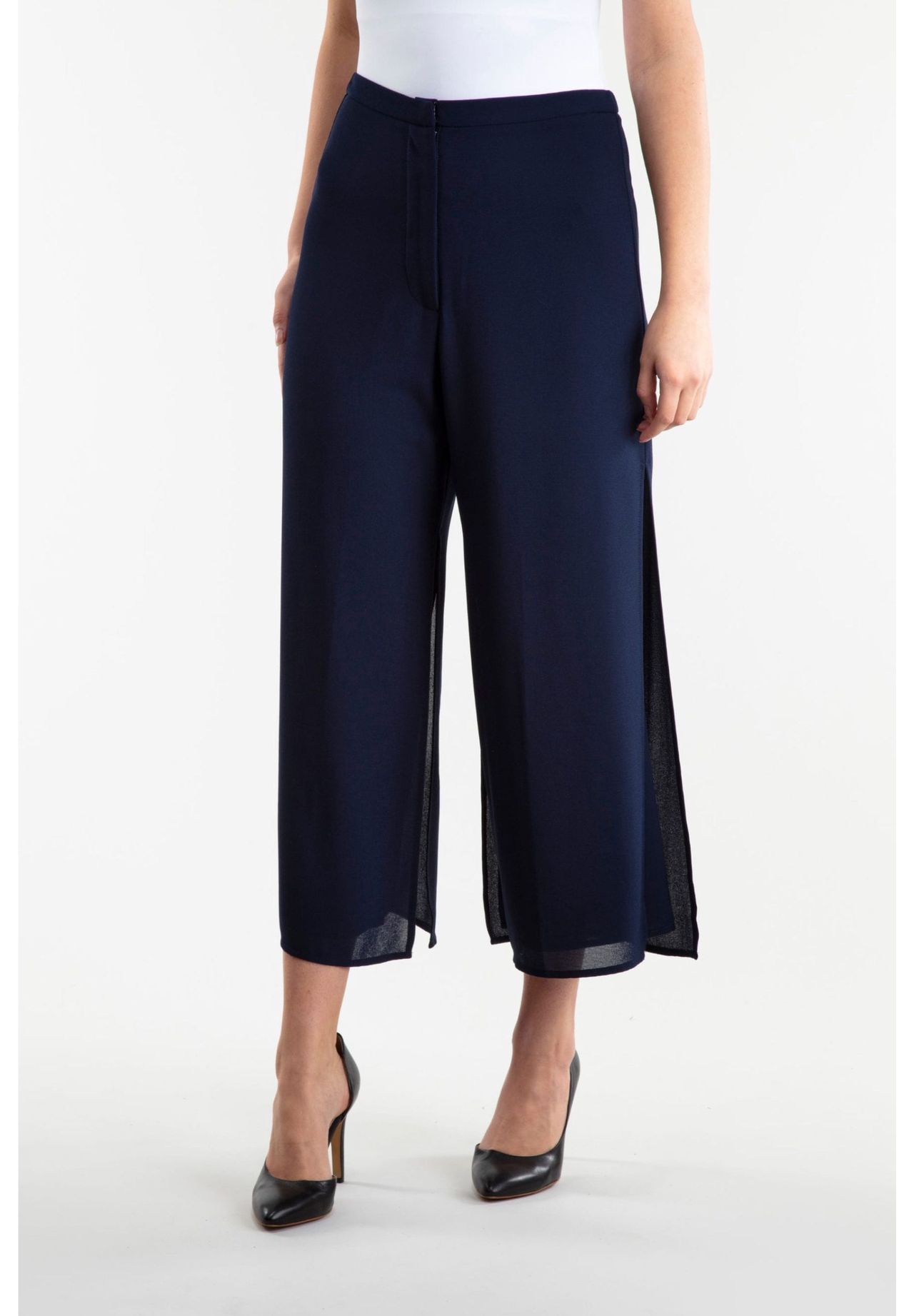Обработка в два слоя. Боковые разрезы. На поясе кнопка-крючок, молния. Длина штанины: 94 см без пояса для 40-го размера. Внутренняя длина штанины: 64 см. 100% полиэстер. Инструкции по стирке: щадящий режим при 30°C, не сушить в стиральной машине, сухая чистка в обычном режиме, не отбеливать, не гладить в горячей воде.