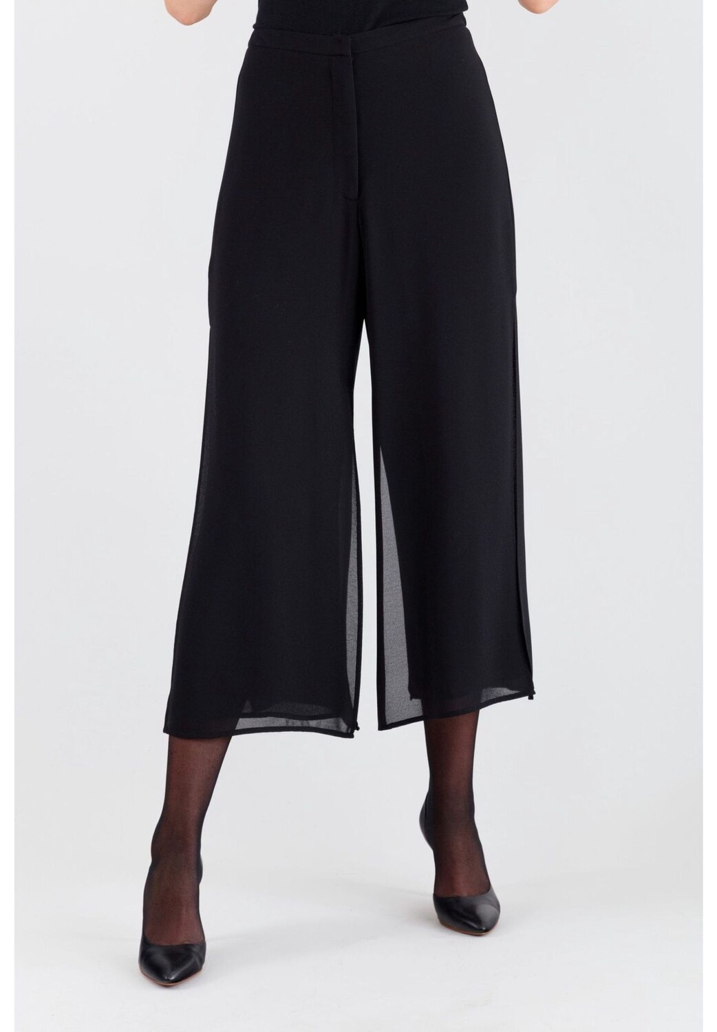 Обработка в два слоя. Боковые разрезы. На поясе кнопка-крючок, молния. Длина штанины: 94 см без пояса для 40-го размера. Внутренняя длина штанины: 64 см. 100% полиэстер. Инструкции по стирке: щадящий режим при 30°C, не сушить в стиральной машине, сухая чистка в обычном режиме, не отбеливать, не гладить в горячей воде.
