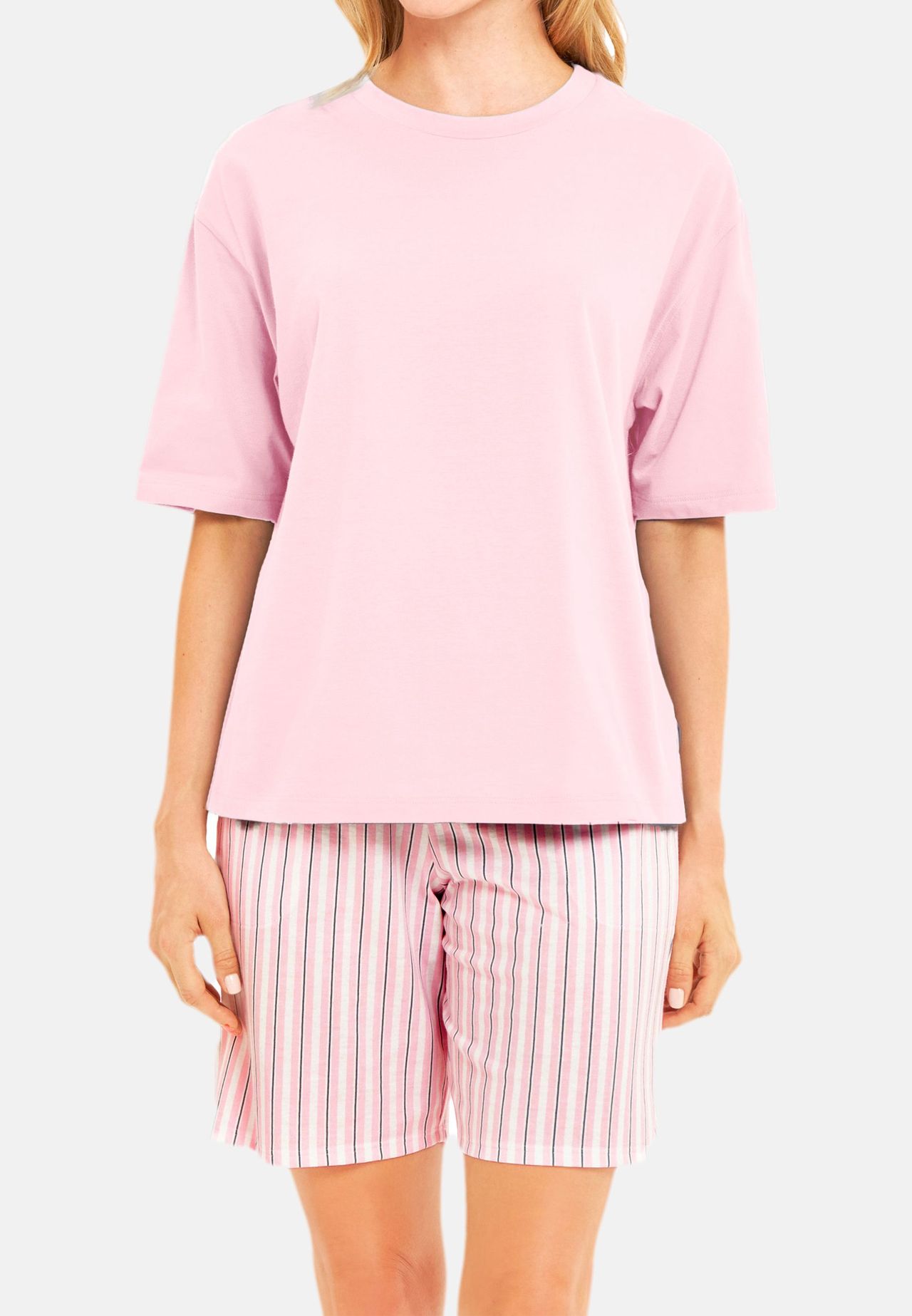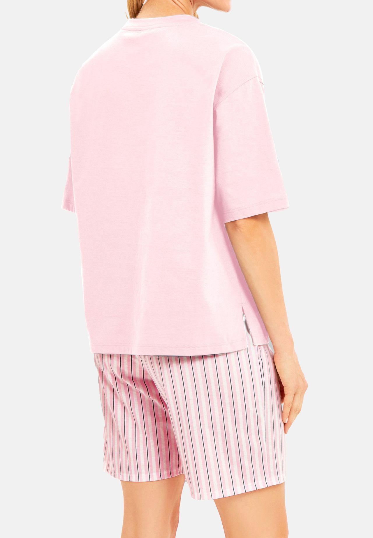 Общие инструкции по уходу: бережный цикл при температуре до 40°C, Не подвергать машинной сушке, Не подвергать химчистке, Отбеливание запрещено, Гладить при средней температуре Инструкции по уходу за тканями: Деликатный цикл при 40° C, не отбеливать, не сушить в стиральной машине, гладить при умеренной температуре, не подвергать химчистке Материал одежды: Комбинезон: 100% хлопок Описание предмета: Пижамный комплект, состоящий из рубашки с короткими рукавами и брюк длиной 7/8. Рубашка с круглым вырезом имеет повседневный крой, заниженные рукава и боковые разрезы по подолу для свободы движений и комфорта. Брюки оснащены удобным мягким эластичным поясом, имеют изящную окантовку на поясе и практичные боковые карманы. Спортивный полосатый принт завершает дизайн. Особенности: Комплект, состоящий из топа с короткими рукавами и коротких брюк Брюки с широким эластичным поясом и боковыми карманами Рубашка в стиле casual перекрывающие руки Примечание по размеру: изделие нормальное Длина: Короткое Вырез: Круглый вырез Длина рукава: Короткий рукав Карманы спереди, сзади, внутренние: Боковые карманы