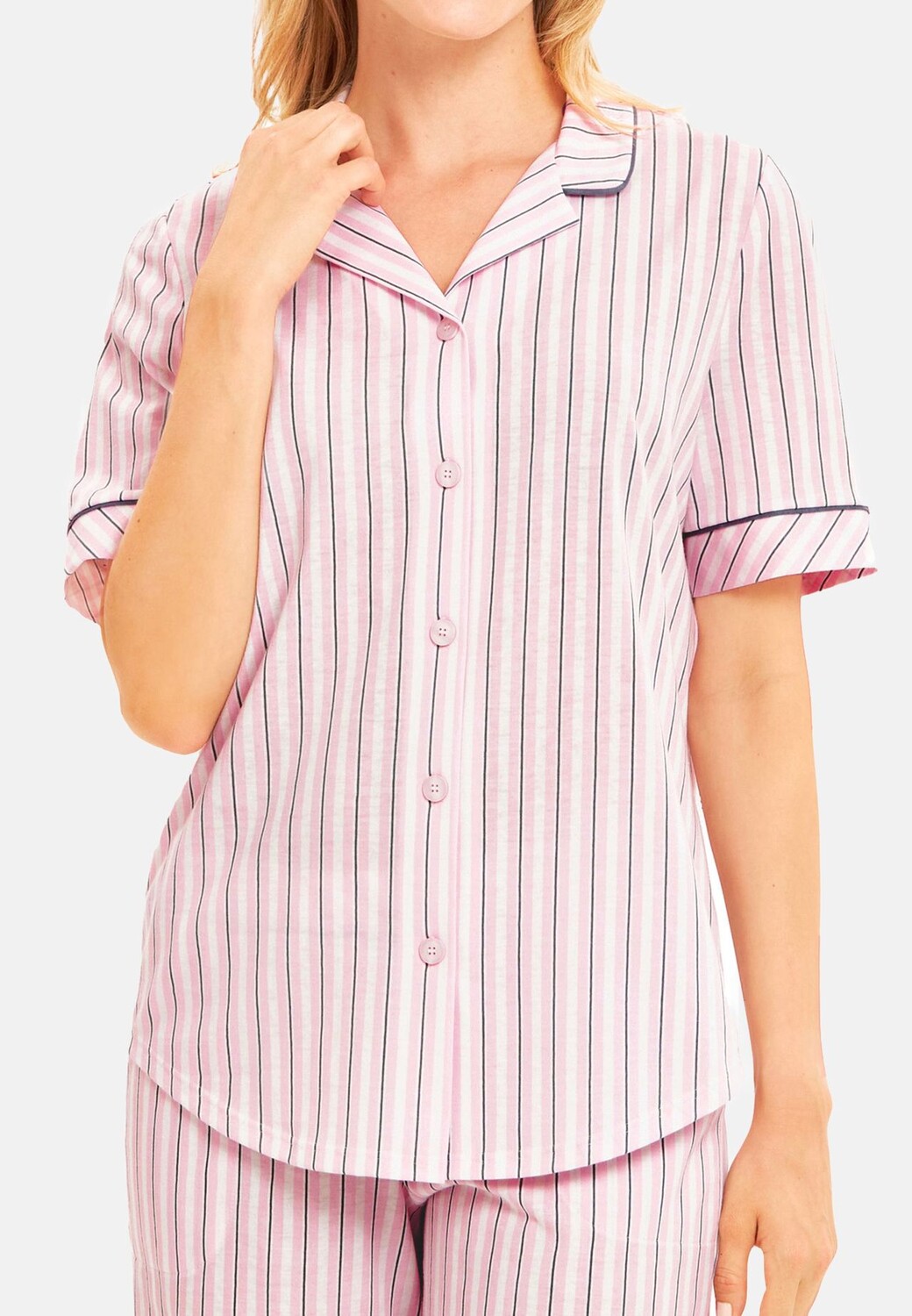 Пижамный топ с короткими рукавами в мужском стиле впечатляет застежкой на пуговицы спереди и небольшим воротником с лацканами. Кант по краю воротника и рукавов придает изделию повседневный вид. Слегка закругленный край завершает дизайн.