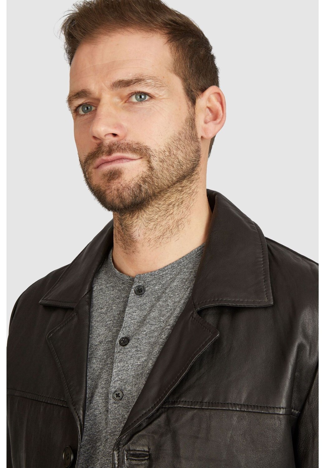 Повседневная альтернатива тренчу! В этом мужском коротком кожаном пальто вы всегда будете хорошо одеты. Благодаря воротнику с лацканами, планке с пуговицами и застежкам на рукавах он выглядит элегантно и является идеальным дополнением к изысканным нарядам с брюками чинос и рубашкой или рубашкой поло. Практичные боковые карманы дополняют общий образ, а мягкая кожаная поверхность и подкладка из смесового хлопка обеспечивают необходимый уровень комфорта. Номер модели: BUG-Паоло