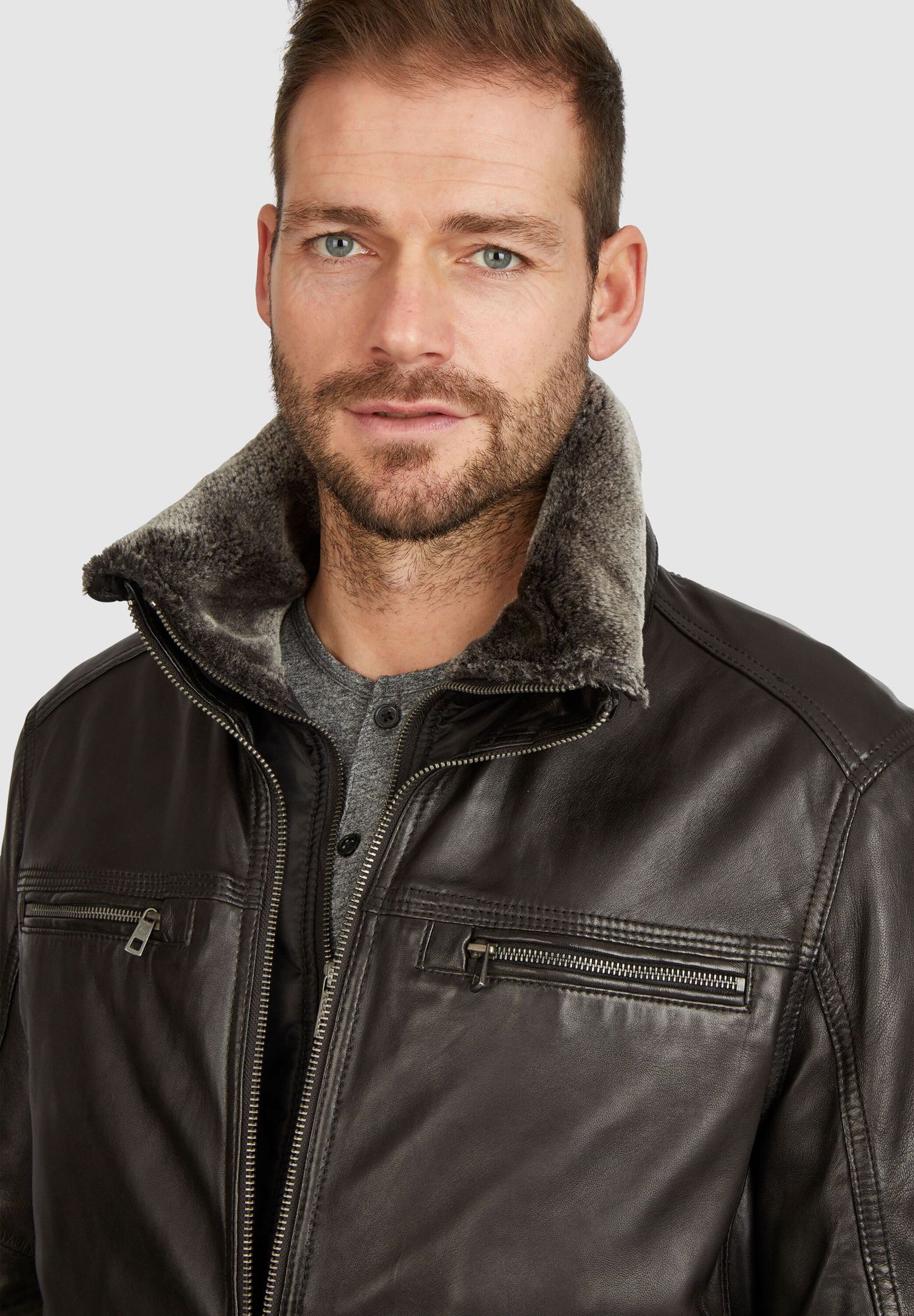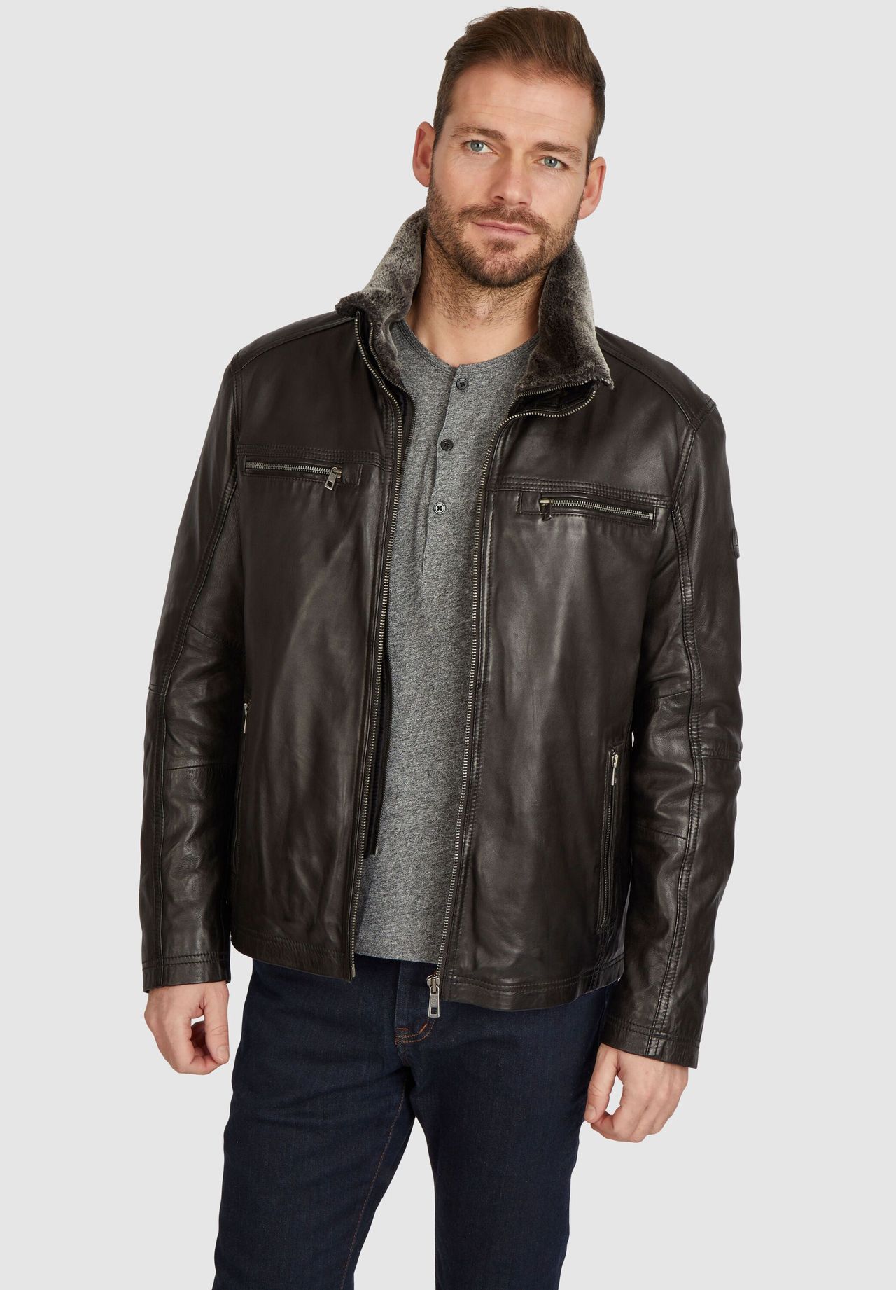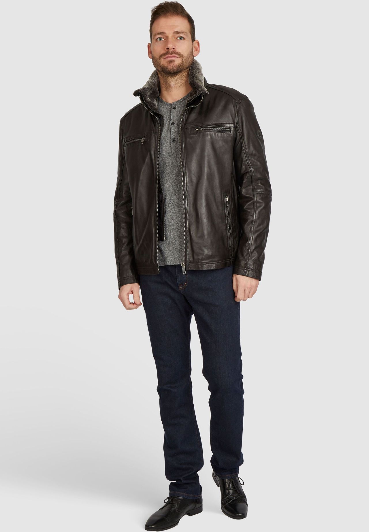 В этой кожаной куртке вы всегда будете в моде. Благодаря блестящей коже, декоративным швам и карманам на молнии он выглядит всегда элегантно и хорошо сочетается как с элегантными, так и с повседневными сочетаниями. Дополнительная вставка в куртке с мягким воротником-стойкой окажется практичной вещью: она не только отлично выглядит, но и защитит от ветра и непогоды в прохладное время года. Номер модели: BUG-Gerero