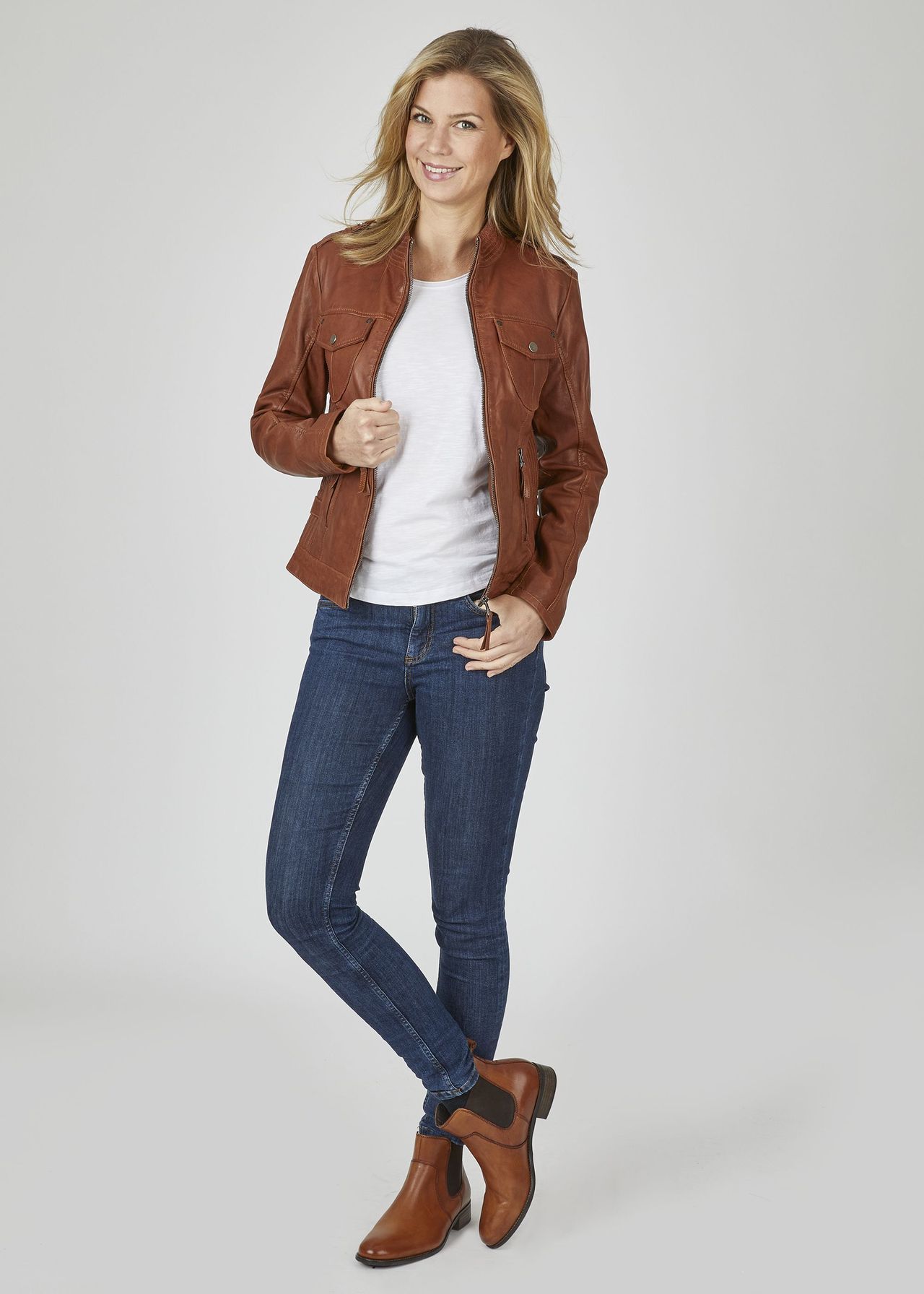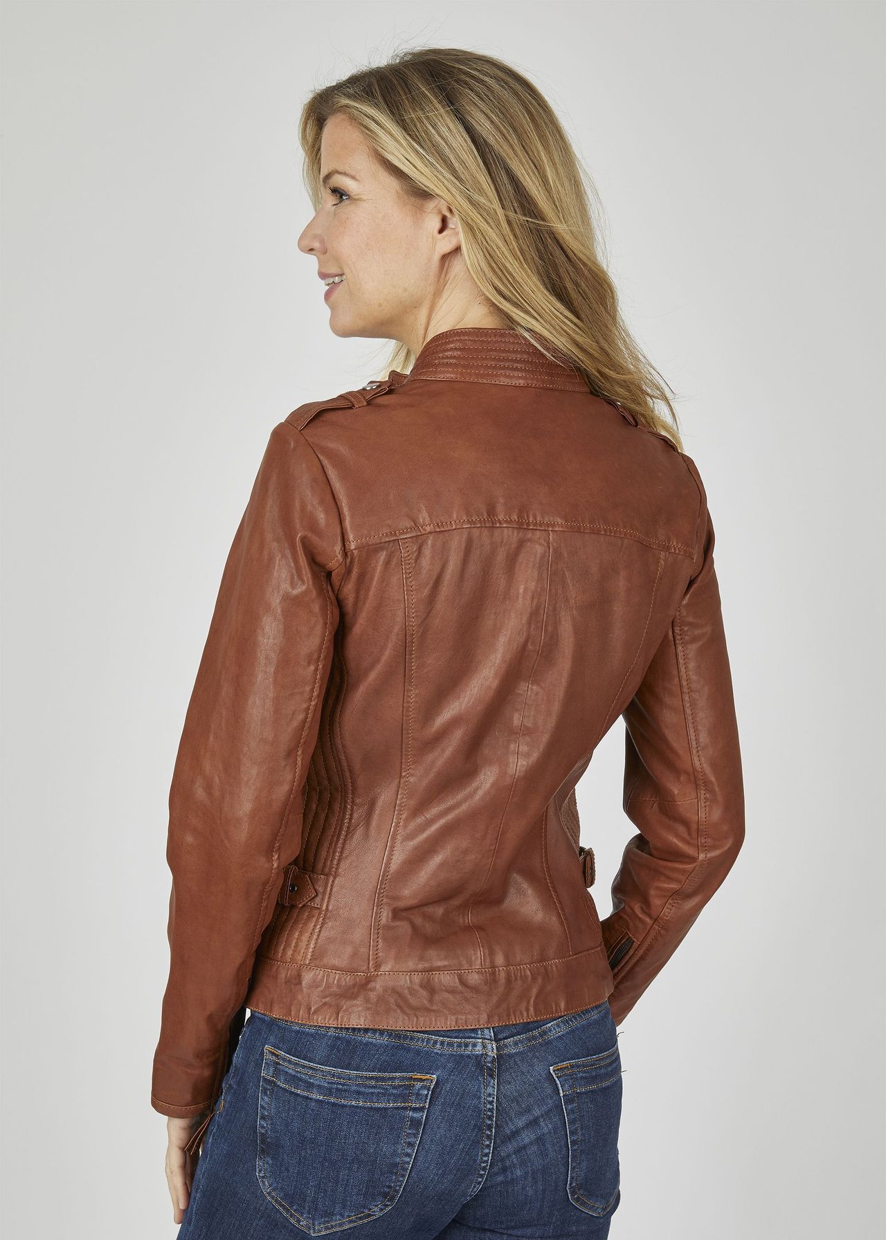 В этой красивой женской кожаной куртке от 7eleven вы всегда будете выглядеть безупречно. Высококачественная кожа наппа ягненка растительного дубления особенно мягкая и в сочетании с облегающим кроем обеспечивает оптимальный комфорт при ношении. Эта кожаная куртка тщательно продумана и включает в себя декоративные ремни на плечах и бедрах, а также декоративную строчку на воротнике и по бокам. Еще деталь: рукава регулируются по ширине с помощью молний. Модель №: SEL-Elena7E