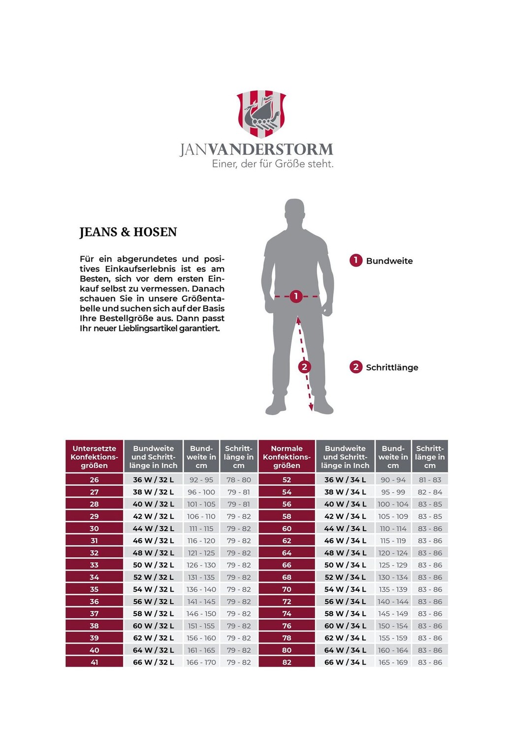 ЯН ВАНДЕРСТОРМ — ваш эксперт по мужской моде больших размеров. Удобные джинсы также доступны для парней крепкого телосложения. Джинсы JOEL представлены в двух сериях: синие джинсы и брюки под живот. Эффект использования придает джинсам смелый стиль. Вырез под живот означает: пояс расположен немного ниже спереди и немного выше сзади, чем в обычных джинсах. Благодаря этому дополнительному крою вы получаете прочный вид джинсов и свободу движений. где вам это нужно. Мы также поставляем соответствующий ремень. +ПОДХОДЯЩИЙ ПУНКТ: Удобный стиль из нашей коллекции +Fit. Благодаря нашему специальному крою с заниженным поясом эти брюки удобно сидят под животом спереди, а более высокий вырез сзади предотвращает выскальзывание верха. Наш специальный крой +short size имеет регулируемую ширину талии по мере увеличения размера одежды. Высота талии и планка на молнии укорочены, что обеспечивает идеальную посадку для мужчин с короткими ногами.