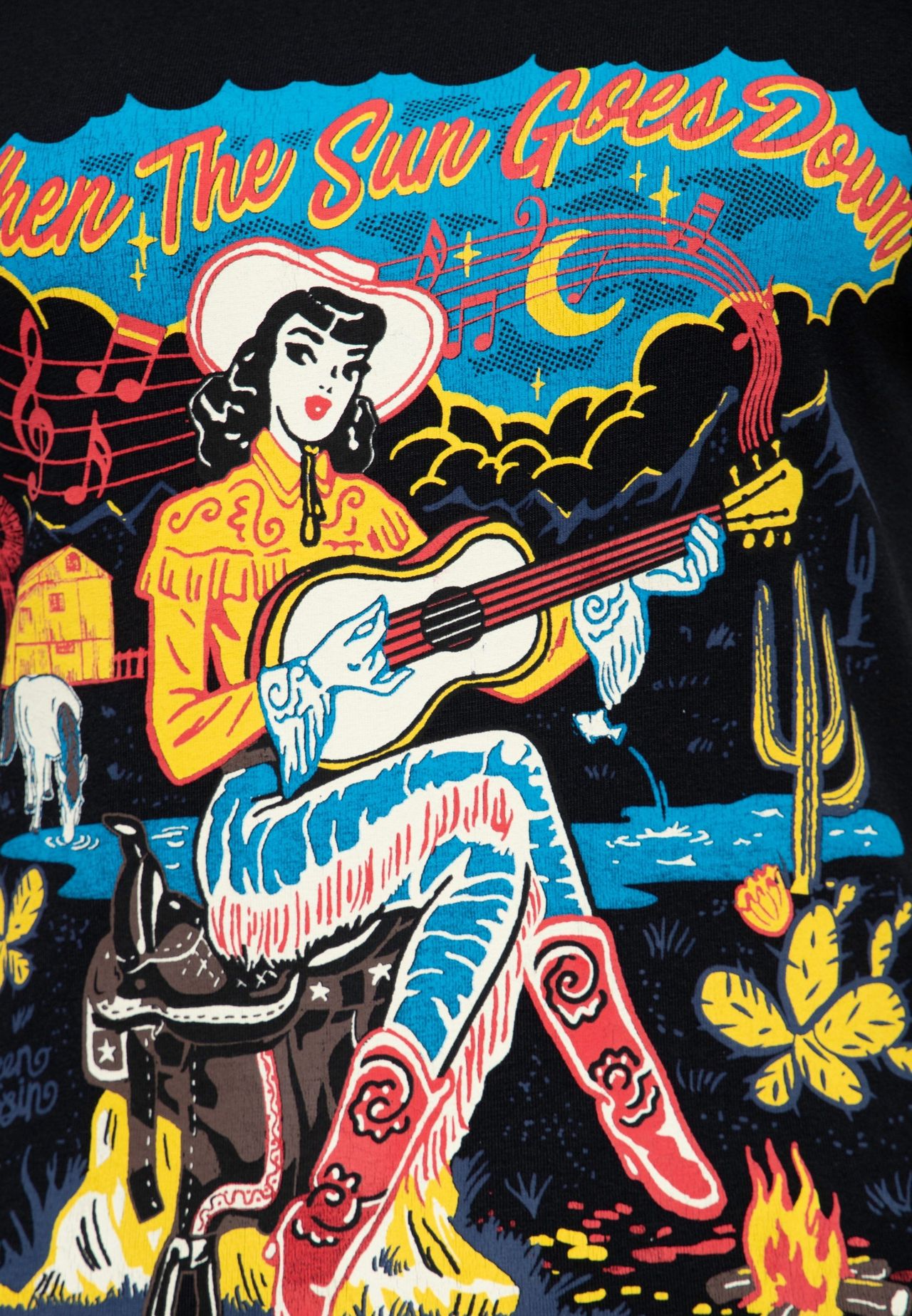 Позвольте себе перенестись на Дикий Запад, где садится солнце и потрескивает костер, а меланхоличные звуки гитары рассказывают истории ковбоев и девушек. Футболка Queen Kerosin с надписью «When The Sun Goes Down» отражает романтический и авантюрный дух жизни Дикого Запада. Облегающий крой футболки подчеркнет ваш силуэт, а классический круглый вырез и высококачественная смесь хлопка и эластана обеспечат максимальный комфорт. Тонкая этикетка с логотипом на подоле добавляет элегантную деталь и завершает общий образ. Вдохновитесь тоскливым и авантюрным духом Запада и носите этот вневременной образ в повседневной жизни.