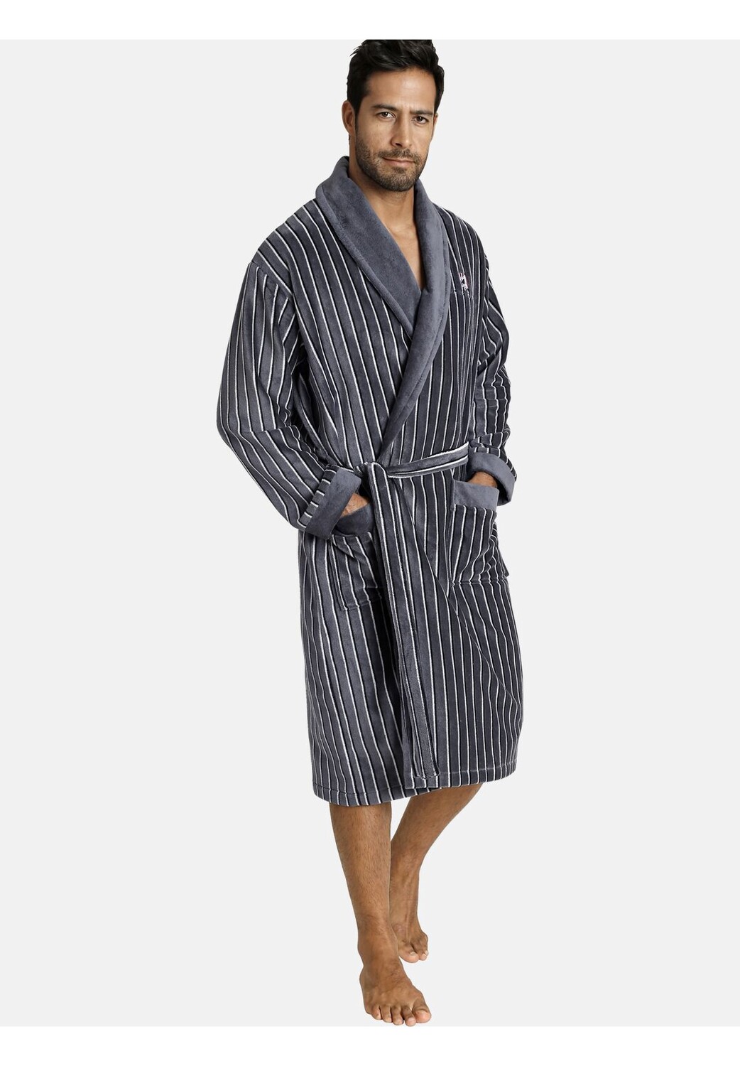 ЯН ВАНДЕРСТОРМ — ваш эксперт по мужской моде больших размеров. Надев его, вы вряд ли захотите его снимать: халат RODIN балует вас своей пушистостью и просто хорошо смотрится в полосатом дизайне с однотонным шалевым воротником, краями рукавов и краями карманов. Настолько хорош, что хочется носить его с завтрака до вечера. Застегивается классическим способом на завязывающийся пояс. Вышивка в цветах Норвегии на левой груди придает еще больше классности: лодка викингов, нанесенная в виде герба, ясно показывает, где бьется сердце владельца, а надпись JV гарантирует качество. Комфортная посадка. 90% хлопок, 10% полиэстер. Машинная стирка.