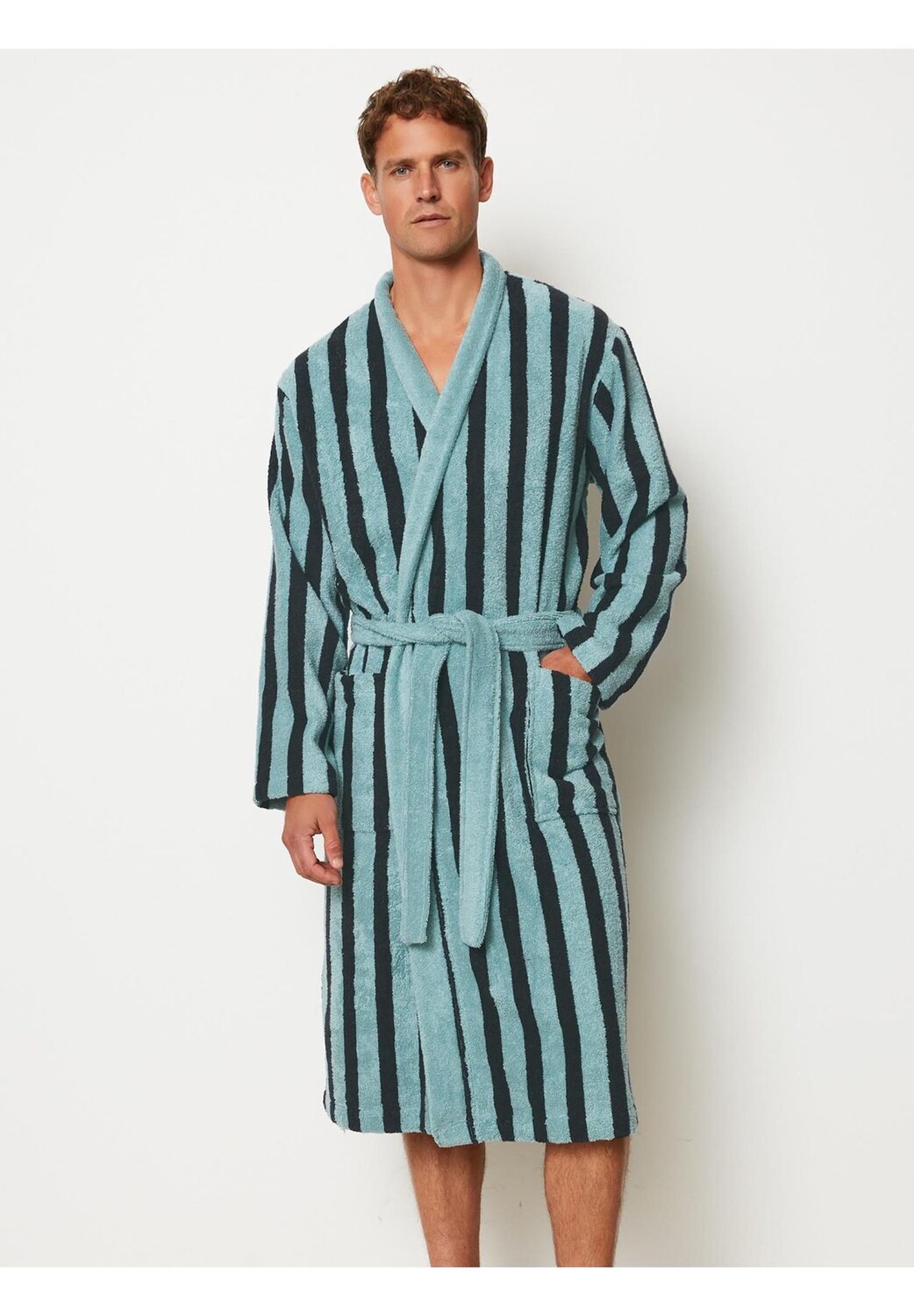 Особенности: Махровый халат из чесаного органического хлопка. Окрашенные пряжей жаккардовые полосы современных цветов и классический крой.