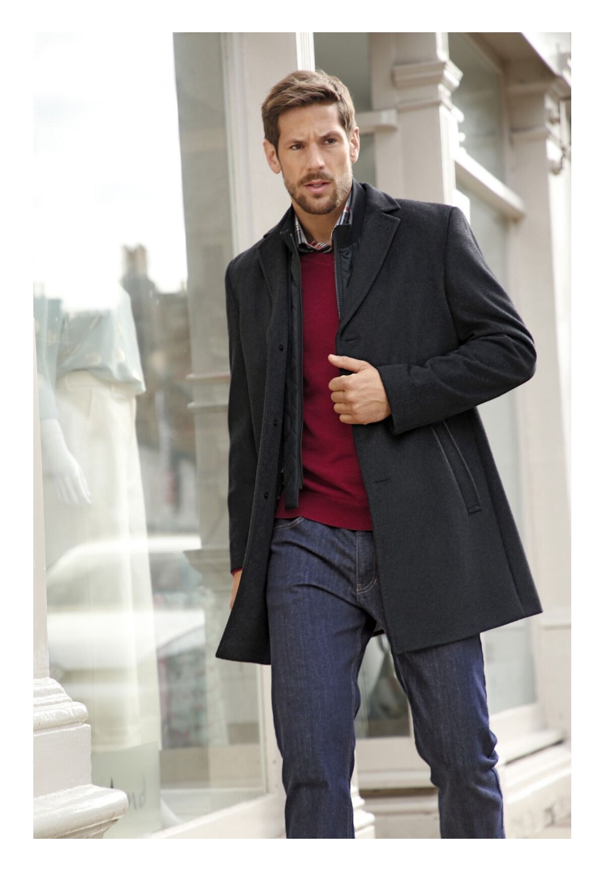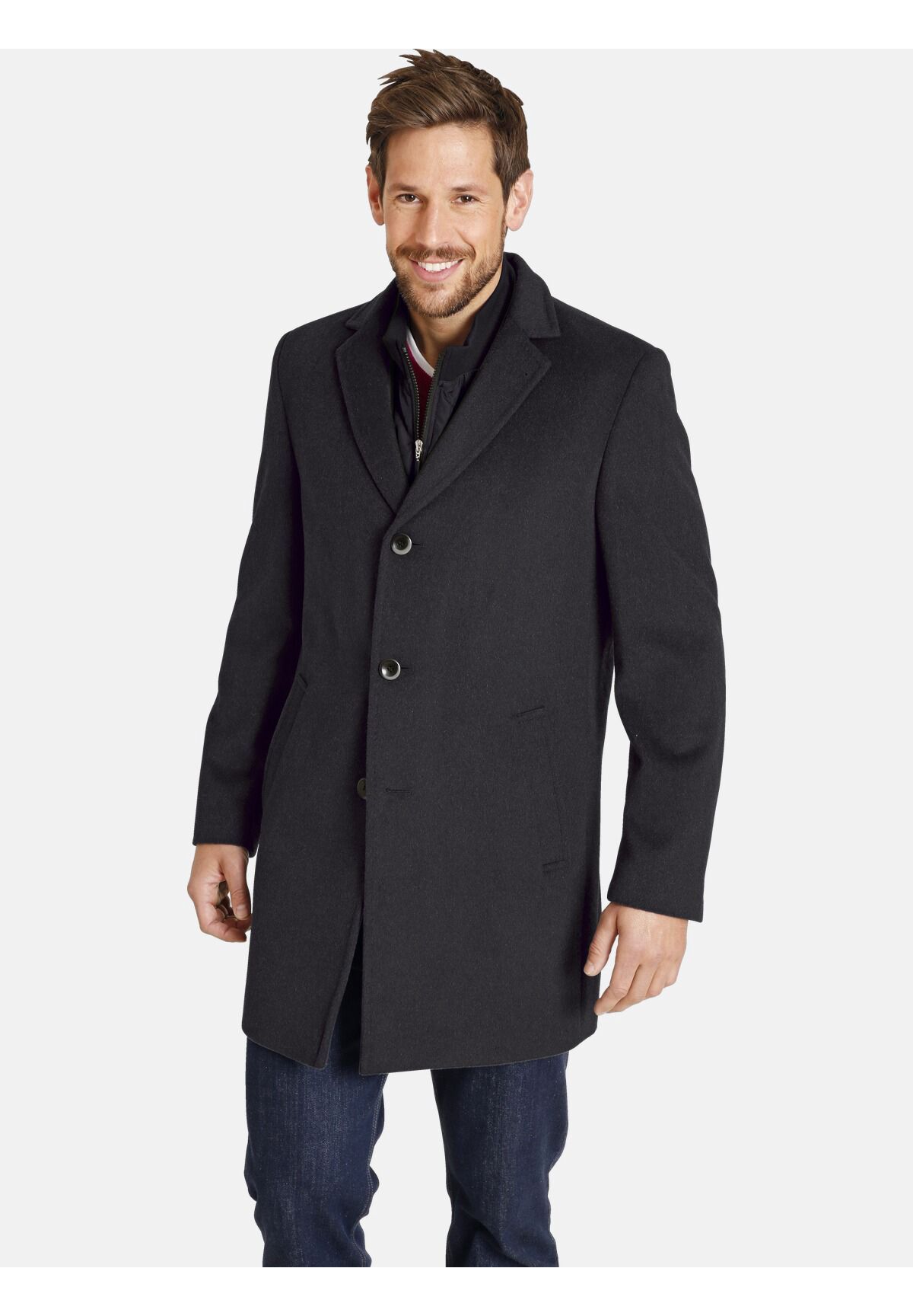 ЯН ВАНДЕРСТОРМ — ваш эксперт по мужской моде больших размеров. Стильно в переходный период: шерстяное пальто UNSKA со съемным тамбуром – изюминка начала осеннего сезона. Вставка с ребристым воротником и стеганая передняя часть придают пальто спортивный вид. При разделении открывается классическое шерстяное пальто с лацканами. Закрывается на кнопки. Стильное пальто. Материал 80% полиэстер, 20% шерсть. Подкладка: 100% полиэстер.