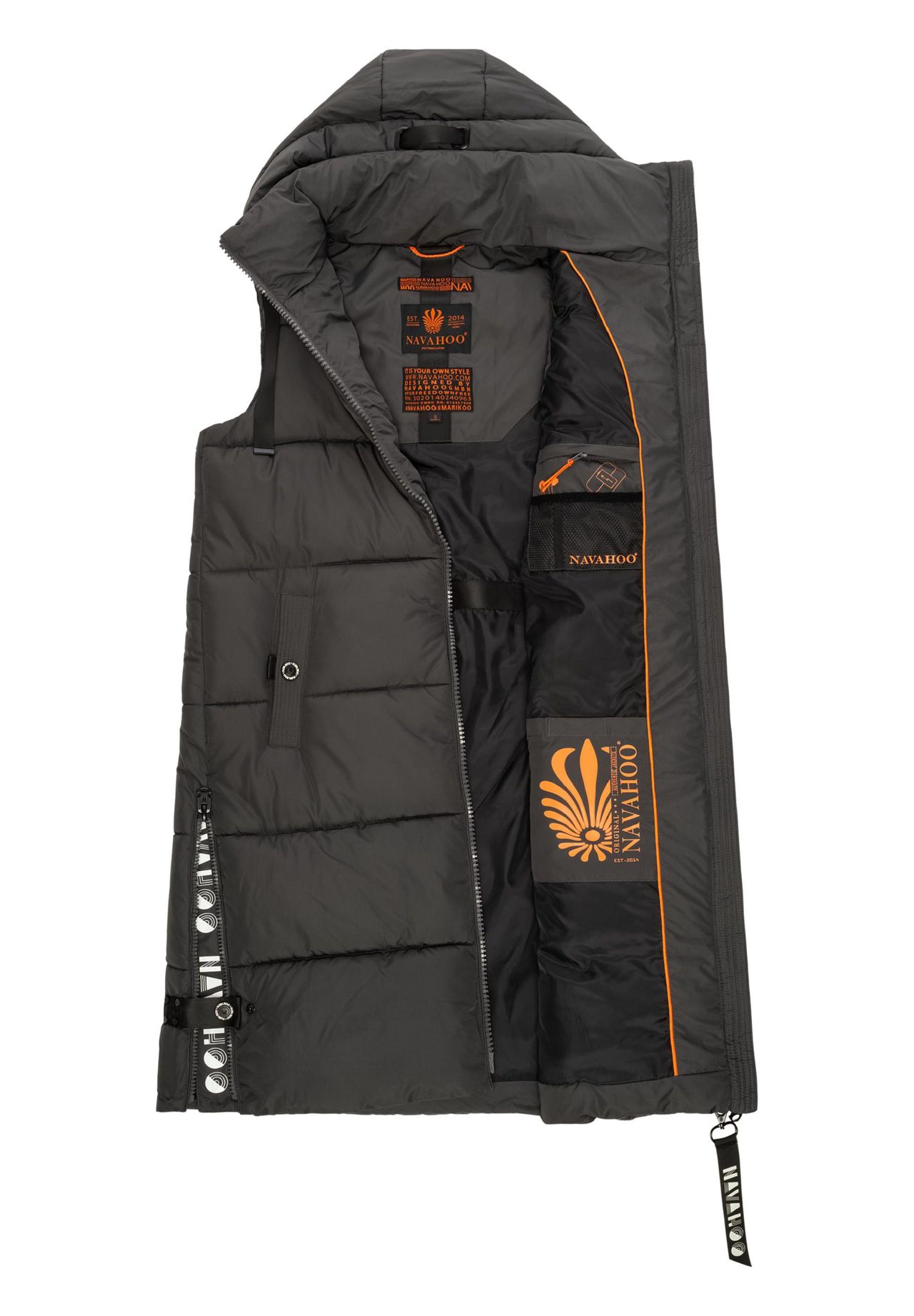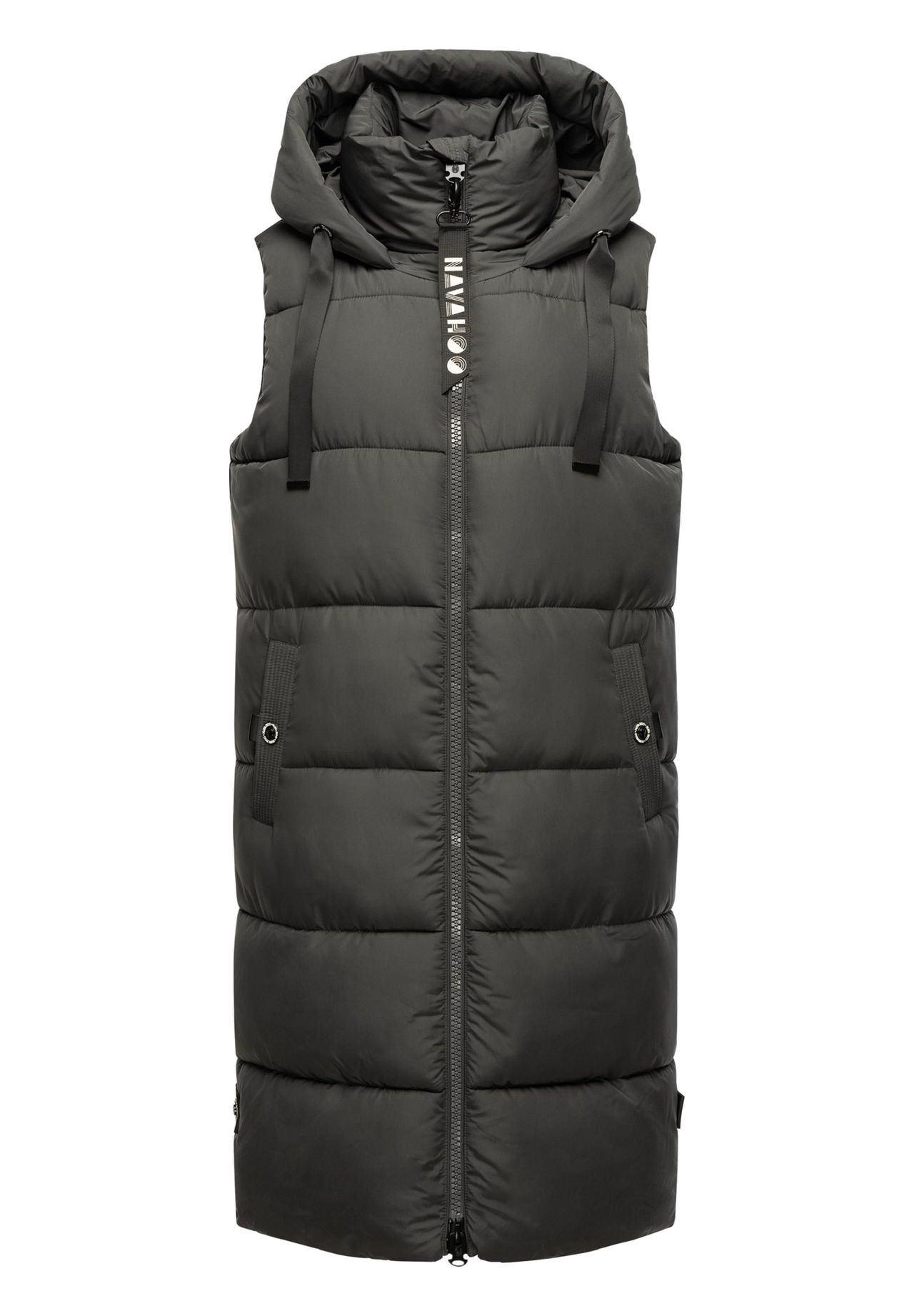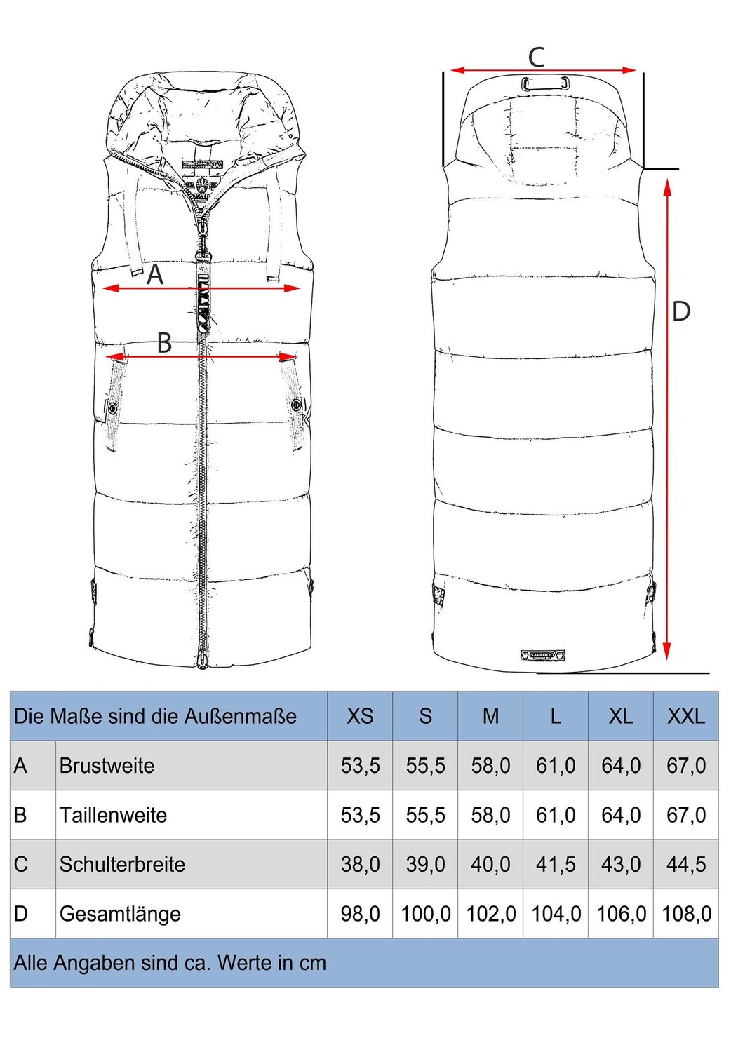 ВИД: Длинный женский длинный жилет без рукавов с большим регулируемым по ширине капюшоном от Navahoo - при правильном сочетании идеален для холодного времени года (осени и зимы), а также для прохладных весенних дней МАТЕРИАЛ: Жилет для отдыха (длинный жилет) ) Изготовленная из сверхмягкого, матового мерцающего внешнего материала, теплая мягкая подкладка гарантирует очень удобную посадку и в сочетании с воротником-стойкой сохраняет тепло. под него можно надеть толстый свитер, длинный жилет имеет один верх длиной до колен, но не ограничивает свободу движений благодаря боковым разрезам (на молнии). ДЕТАЛИ: Стеганая куртка без рукавов с модными лентами на капюшоне и многочисленными внутри и внешние карманы, в которых, помимо прочего, достаточно места для хранения мелких ценностей. Это стильно. Длинный жилет идеально подходит для занятий спортом, например, прогулки с собакой, походов или прогулок по городу! Стеганый женский жилет без рукавов с капюшоном от Navahoo Правильное сочетание идеально подходит для осени, зимы и весны Высокое качество, высокое качество изготовления Прямой крой, супер длина до колен Мега мягкий матовый мерцающий внешний материал (водоотталкивающий) Очень удобно носить в спортивном стиле жилет для активного отдыха Высокозастегивающаяся передняя молния с защитой подбородка защищает от ветра и холода. Капюшон можно индивидуально регулировать с помощью стильной ленты. 2 боковых кармана на кнопках. 4 внутренних кармана с достаточным пространством для хранения небольших ценных вещей. и прорези для ходьбы (на молнии и кнопках) обеспечивают большую свободу движений. Можно стирать в машине при 30°C.