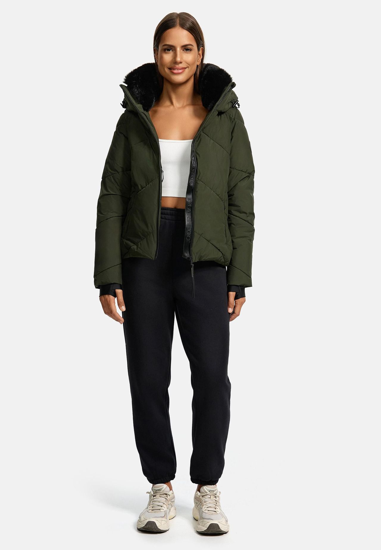 ВИД: Современная зимняя стеганая куртка впечатляет своим спортивным, элегантным видом и изысканным стеганым узором. Идеально подходит для холодных дней, его можно комбинировать разными способами, будь то повседневный или городской. Стильный вариант на зиму. МАТЕРИАЛ: Благодаря водонепроницаемому и ветронепроницаемому наружному материалу куртка для активного отдыха надежно защитит от непредсказуемой погоды осенью и зимой. Гладкий, легкий и нескользящий материал обеспечивает высокий уровень комфорта, а внутренняя подкладка сохраняет тепло. ПОСАДКА: Осенняя куртка длиной до бедра подчеркивает фигуру и подчеркивает силуэт благодаря женственному крою. Съемный регулируемый капюшон и высокий воротник на подкладке с уютной отделкой из искусственного меха обеспечивают дополнительную защиту от ветра и непогоды. ДЕТАЛИ: Практичные функции, такие как водонепроницаемая молния спереди, манжеты с отверстиями для больших пальцев. два внутренних и два боковых кармана делают куртку особенно функциональной. Съемная отделка из искусственного меха на воротнике придает изделию элегантный вид. Эта стеганая зимняя куртка обеспечит оптимальную защиту и стиль для холодных зимних дней и переменчивой погоды. Идеально подходит для повседневной жизни или активного отдыха, сочетает в себе функциональность и модный дизайн. Спортивная, элегантная зимняя стеганая куртка длиной до бедра от Marikoo. Водонепроницаемый и ветронепроницаемый внешний материал. Большой съемный капюшон (регулируемый шнурком). Высокий воротник с уютной отделкой из искусственного меха. Водонепроницаемая передняя молния. 2 внутренних кармана. 2 наружных кармана с водонепроницаемыми молниями. Эластичные манжеты с отверстие для большого пальца Щадящий цикл при 30 градусах