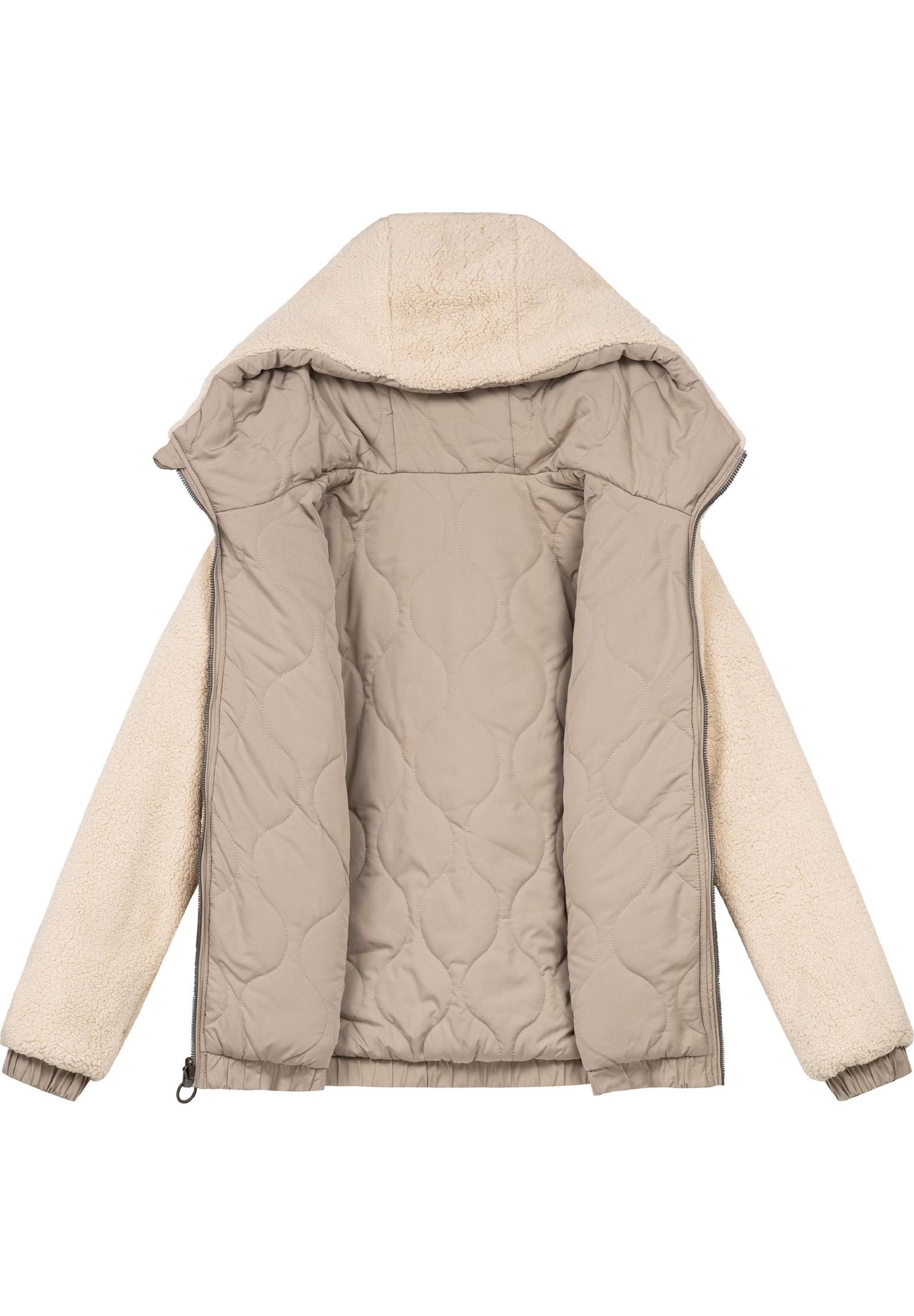 ВИД: Эта универсальная двусторонняя куртка идеально сочетает в себе стиль и функциональность. С одной стороны, он имеет бархатистую, гладкую стеганую поверхность, что создает элегантный и современный вид. С другой стороны, приятный мягкий искусственный мех Тедди создает уютный повседневный стиль, идеально подходящий для непринужденных осенних и зимних дней. МАТЕРИАЛ: Одна сторона двусторонней куртки выполнена из бархатистой гладкой стеганой ткани, а другая сторона — из прочного, приятного искусственного меха плюшевого цвета. Обе версии обеспечивают оптимальную защиту и тепло, а также различные варианты ношения. ПОСАДКА: Прямой крой куртки 2-в-1 обеспечивает повседневную удобную посадку, облегает тело и слегка прикрывает бедра. Идеально подходит для обеспечения тепла без ограничения свободы передвижения. Гибкая двусторонняя опция делает их особенно универсальными. ДЕТАЛИ: Практичные детали, такие как высокозастегивающаяся молния с защитой подбородка и внутренние эластичные ленты на концах рукавов и подоле, предотвращают попадание холодного воздуха. Карманы на молнии на флисовой подкладке на гладкой стороне и карманы для рук на уютной стороне обеспечивают место для хранения и комфорт. Эта женская куртка идеальна для холодных и ветреных дней. Он сочетает в себе защиту и стиль, а также является универсальным благодаря своей двусторонности и идеально подходит для повседневной жизни и зимнего отдыха. Женская двусторонняя куртка с капюшоном для зимы. Молния с защитой подбородка. Прямой крой чуть выше бедер. Тедди по бокам из искусственного меха с боковыми карманами. Бархатистая, гладкая, стеганая сторона с карманами на молнии (на флисовой подкладке). Внутренние эластичные ленты на концах рукавов и по низу. Машинная стирка при 30°С
