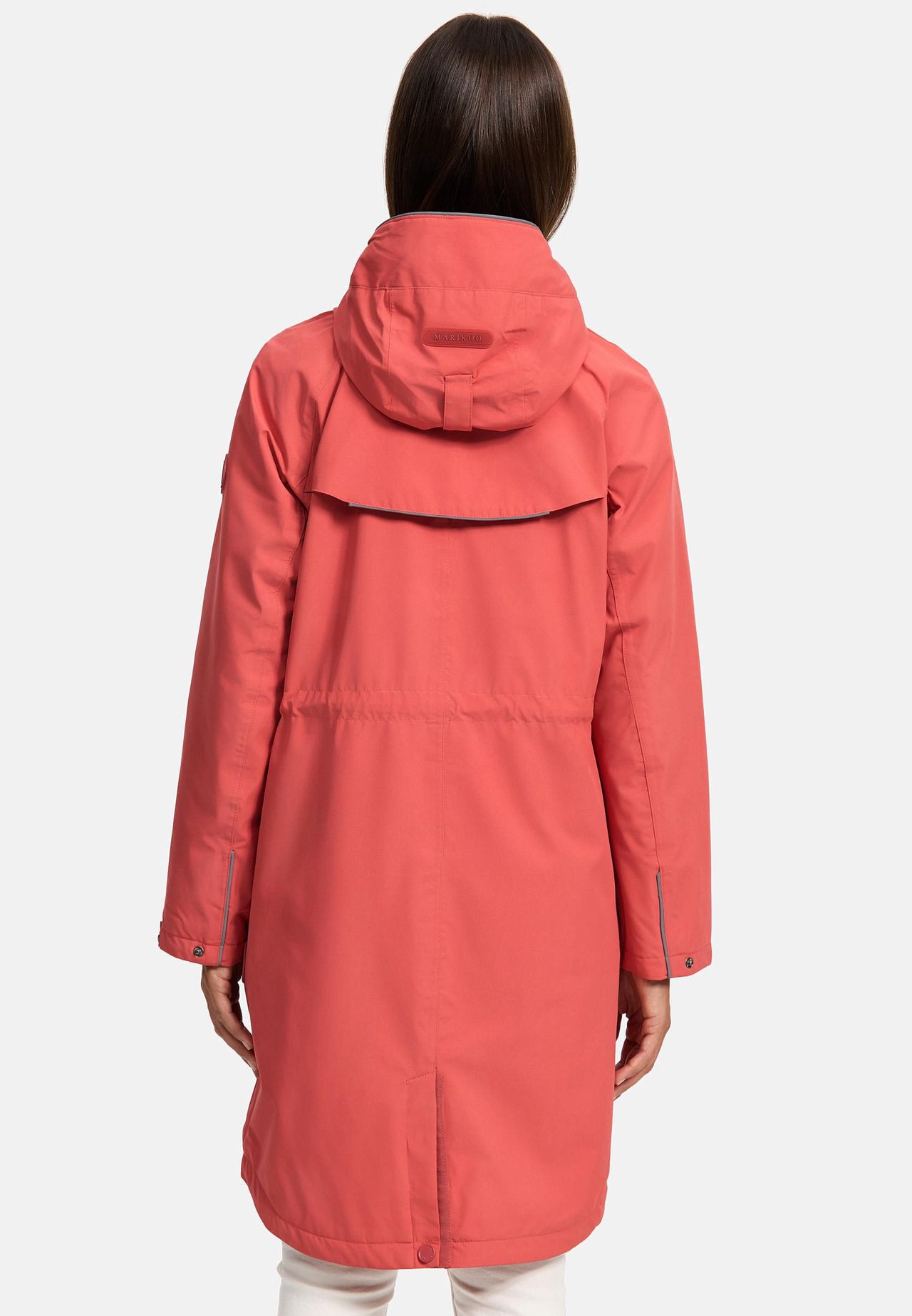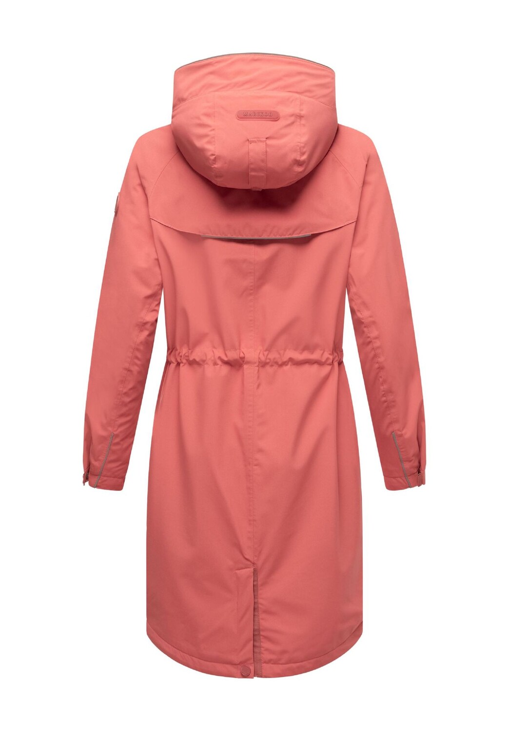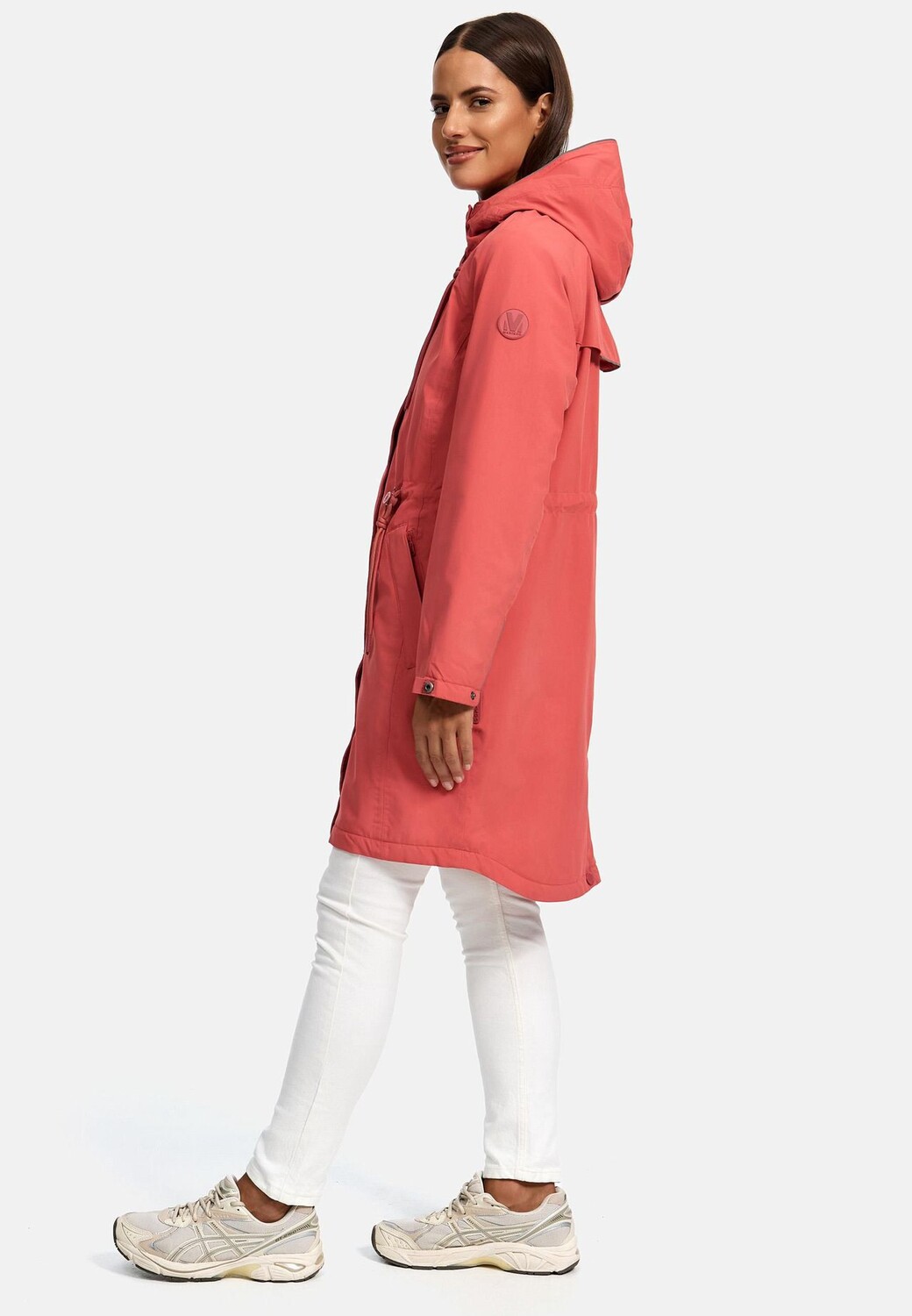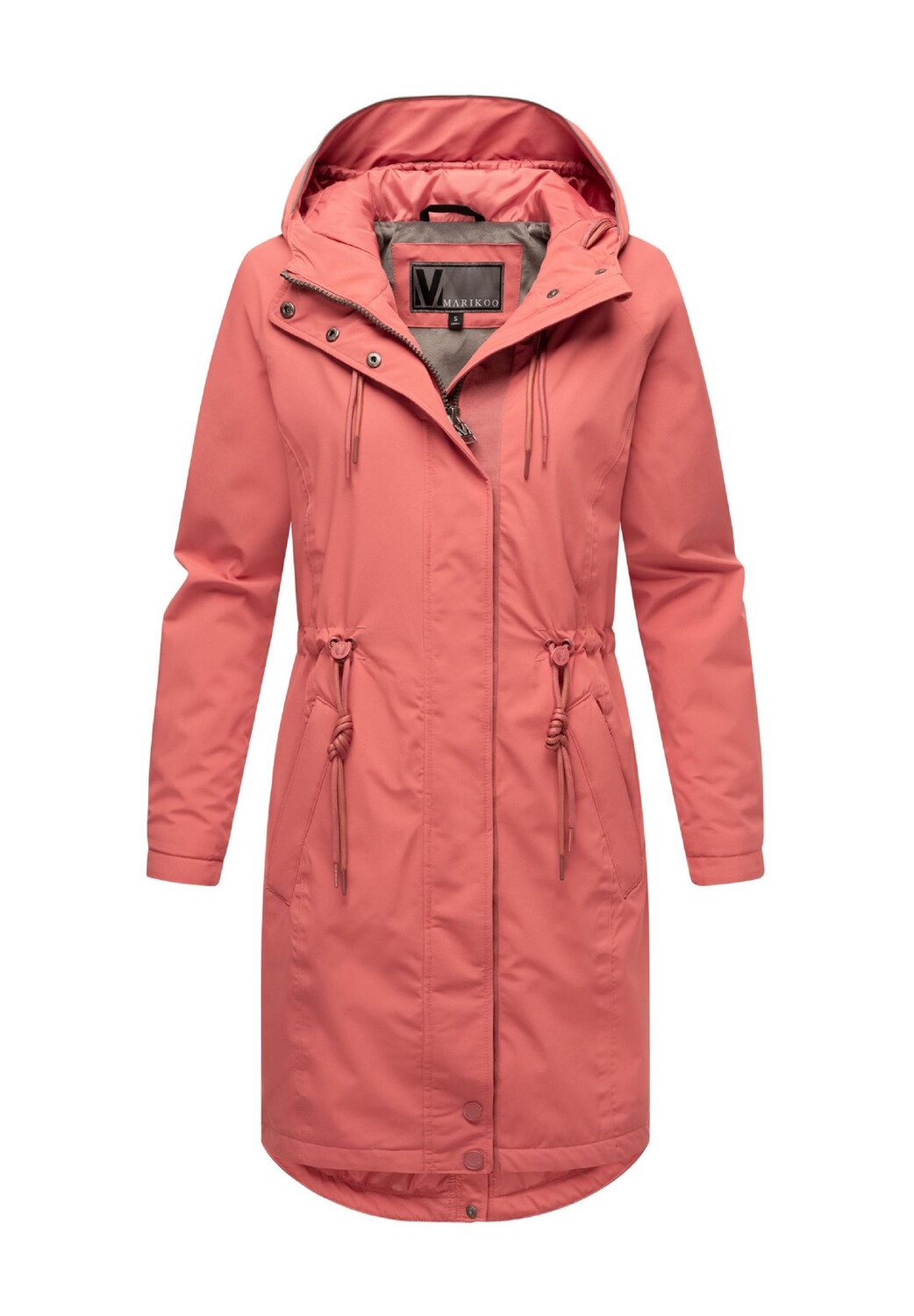 ВНЕШНИЙ ВИД: Стильное женское пальто-переходник впечатляет женственным силуэтом и практичными деталями. Прекрасно сочетается для городских и повседневных образов весной и осенью. МАТЕРИАЛ: Куртка изготовлена из высококачественного материала, известного своей прочностью. Благодаря водонепроницаемым свойствам полупальто защитит от дождя и сохранит сухость даже в переменчивую погоду. Мягкий флис в верхней внутренней части обеспечивает дополнительный комфорт и тепло. ПОСАДКА: Идеальная посадка этого пальто для активного отдыха подчеркнута встроенным шнурком на талии. Длина до колена обеспечивает оптимальную защиту и подчеркивает фигуру. Двусторонняя молния позволяет индивидуально регулировать пальто и обеспечивает свободу движений. ДЕТАЛИ: Ветровка имеет регулируемый капюшон. что обеспечивает дополнительную защиту во время дождя. Концы рукавов регулируются кнопками, а разрез сзади обеспечивает свободу движений. Светоотражающие детали повышают видимость в темноте, а многочисленные внешние и внутренние карманы обеспечивают достаточно места для хранения вещей. Женское пальто – идеальный выбор для переходного периода. Он сочетает в себе стильный дизайн с практичными функциями и идеально подходит для переменчивой погоды. Продуманные детали делают его идеальным спутником на каждый день. Женское переходное пальто от Marikoo, облегающего фигуру кроя длиной ок. до колен Регулируемый капюшон, ширина талии и края рукавов Светоотражающие детали Высокозастегивающаяся двусторонняя молния с защитой подбородка Прорезь для ходьбы (с кнопкой) сзади 2 наружных кармана на водонепроницаемых молниях 2 внутренних кармана на молнии Машинная стирка при 30°C