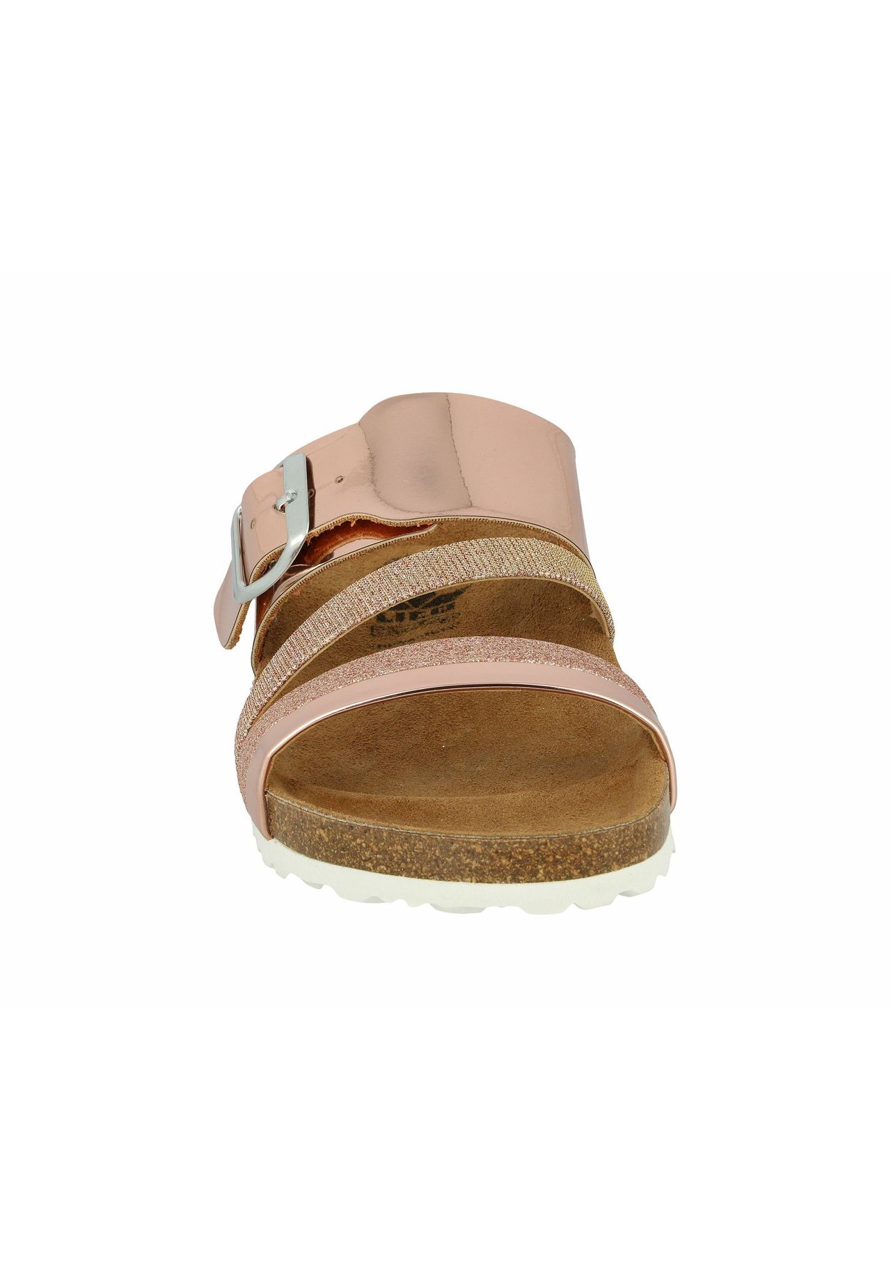 Синтетические мюли, регулируемая пряжка, кожаная стелька, амортизирующая подошва из этиленвинилацетата, стелька из пробки и резины.