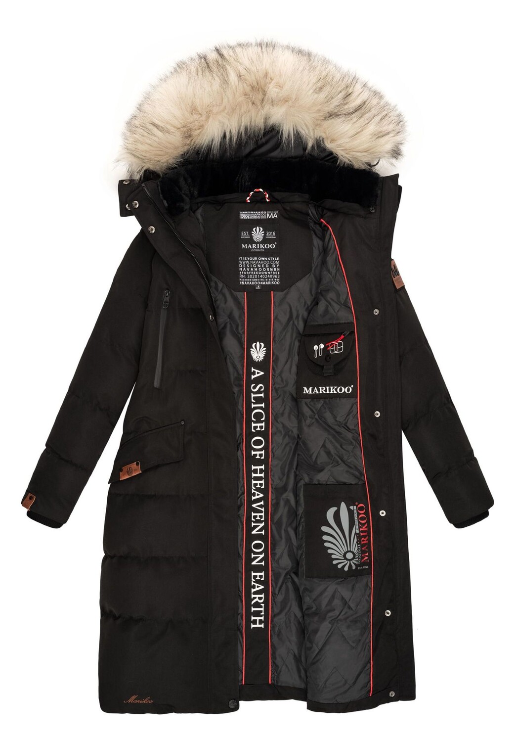 СМОТР: Зимнее пальто от Marikoo в современном стиле со съемным искусственным мехом, воротником на подкладке и съемным капюшоном – отличный универсал в холодное время года! (Осень и зима) МАТЕРИАЛ: Мягкий и прочный внешний материал (ветро- и водоотталкивающий) пухового пальто сохраняет тепло, мягкая внутренняя подкладка с модной стежкой обеспечивает высокий уровень комфорта. ПОДХОД: Длинная зимняя куртка свободного кроя, благодаря модному широкому крою, очень удобен. Можно носить со свитером под ним. Практичная длина до колен сохраняет ноги в тепле. ДЕТАЛИ: Практичный внутренний карман для беспроводных наушников, блока питания и мобильного телефона, внешние карманы на подкладке. чтобы предотвратить холодные руки Широкие ребристые манжеты и высокий воротник сохраняют тепло. Стеганое пальто на мягкой подкладке от Marikoo чрезвычайно универсально и его можно сочетать с многочисленными образами — незаменимая вещь в каждом гардеробе! Теплое женское зимнее стеганое пальто со съемным капюшоном от Marikoo Современный и удобный крой Прочный и водоотталкивающий внешний материал Мягкая внутренняя подкладка с модной зигзагообразной стежкой сохраняет тепло и уют Уютная мягкая меховая подкладка на воротнике (съемная) Съемный капюшон с регулировкой эластичная лента и объемная опушка из искусственного меха (также съемная) Внутренние ребристые манжеты 2 кармана для рук на подкладке с кнопками 2 нагрудных кармана на молнии (водонепроницаемые) Внутренние карманы для беспроводных наушников, аккумулятора и мобильного телефона Высокозастегивающаяся двусторонняя молния спереди с защитой подбородка Передняя молния закрыта планкой на кнопках. Машинная стирка при 30°C. Наружная ткань: 100% полиэстер.