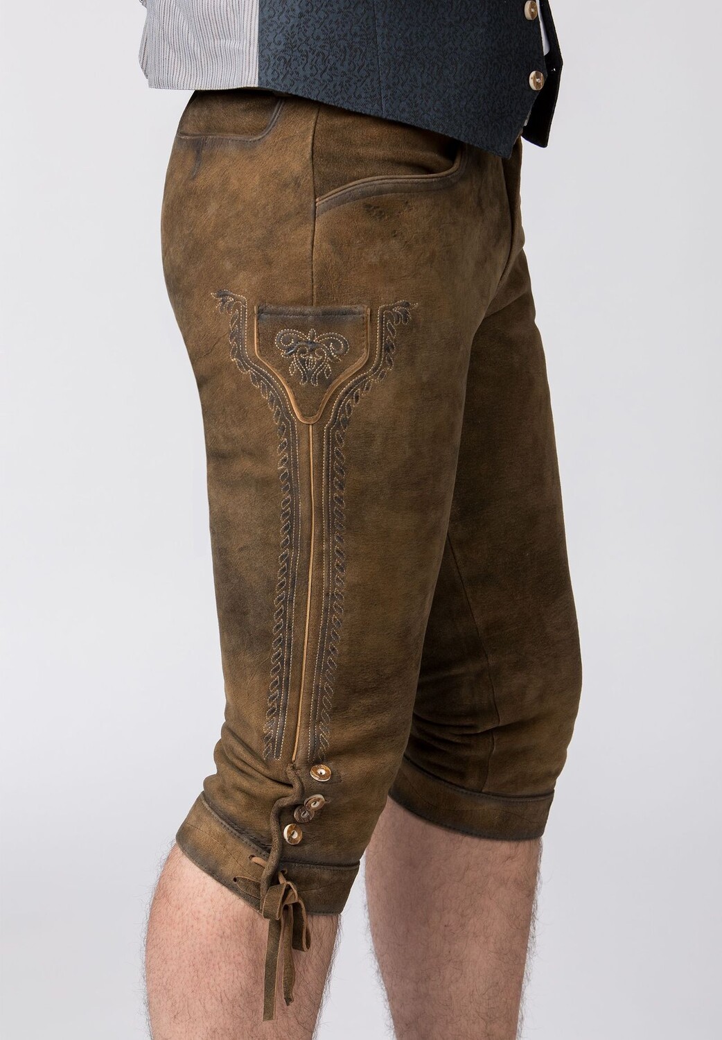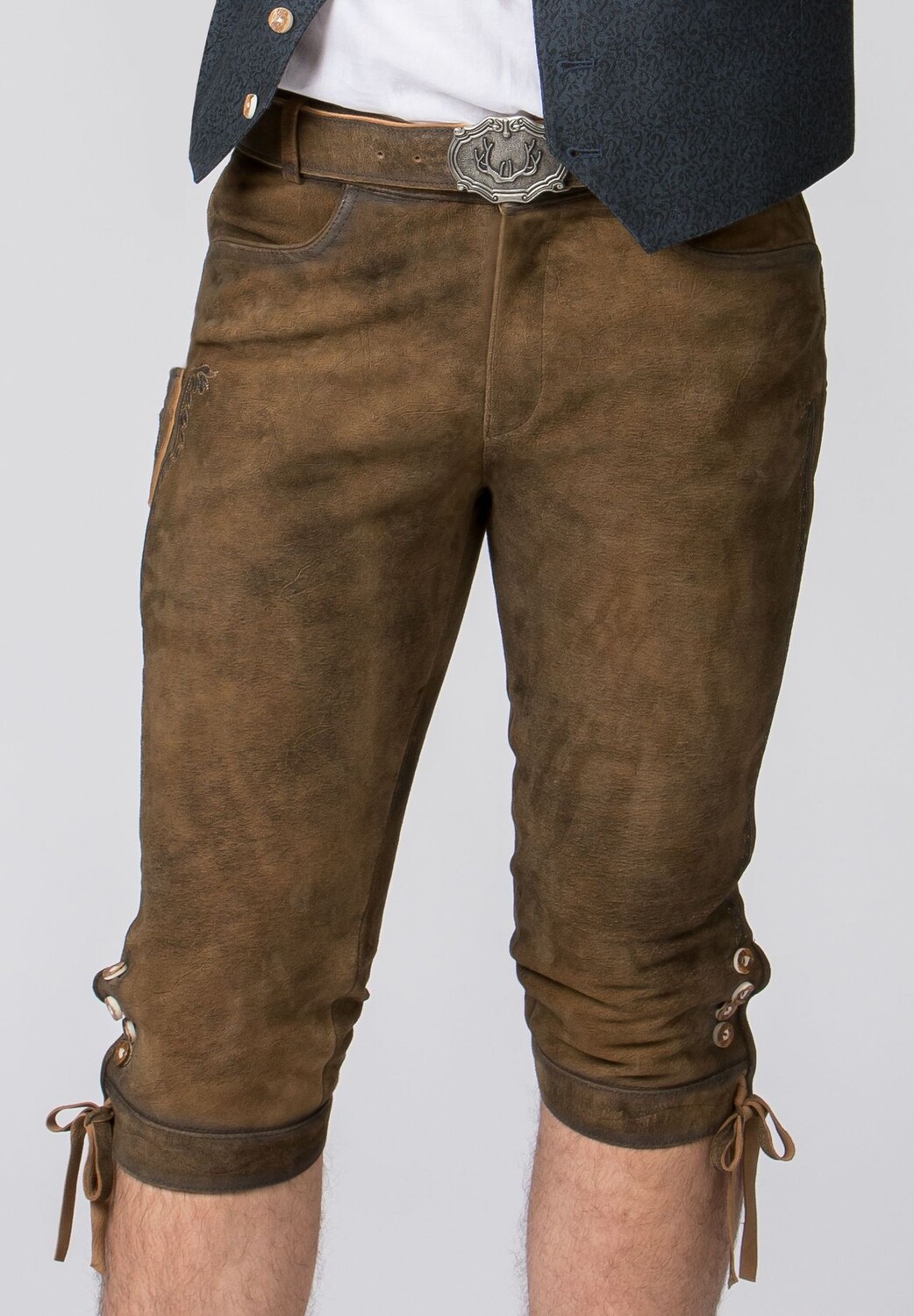 Традиционные ледерхозен Siggi от Stockerpoint Classics. Кожаные брюки длиной до колена из высококачественной дубленой кожи дикого оленя с имитацией оленя отличаются необычной структурой и прекрасно гармонируют с классическими роговыми пуговицами. Вместо нагрудника эти штаны выполнены на молнии. Традиционная вышивка незаметно находится на переднем плане и придает модели типичный характер. Благодаря шнуровке на поясе и манжетах на штанинах его можно индивидуально отрегулировать и адаптировать к фигуре. Брюки дополнены ремнем и пряжкой с изображением оленя цвета старинного серебра. Он универсален и прекрасно сочетается со многими традиционными костюмами.