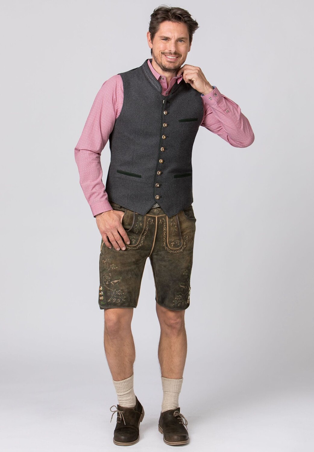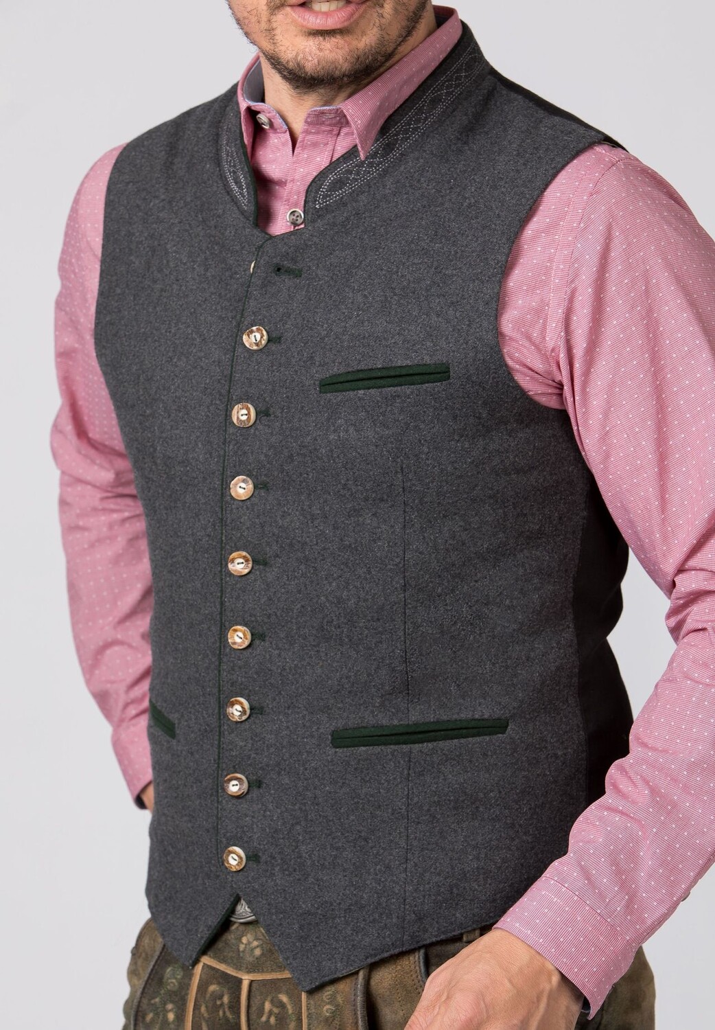 Традиционный жилет Sirius от Stockerpoint Classics. Традиционный жилет изготовлен из высококачественной крапчатой ткани лоден. Классический прямой крой гарантирует очень хорошую и удобную посадку. Гармонично подобранный вышитый воротник-стойка и окантовка подчеркивают особый дизайн. Спинка выполнена из эксклюзивной хлопчатобумажной ткани черного цвета и регулируется с помощью планки. Роговые пуговицы в деревенском стиле искусно дополняют элегантный внешний вид. Традиционный жилет является идеальным дополнением к нашим кожаным брюкам и традиционным жилетам и характеризует классический традиционный образ.