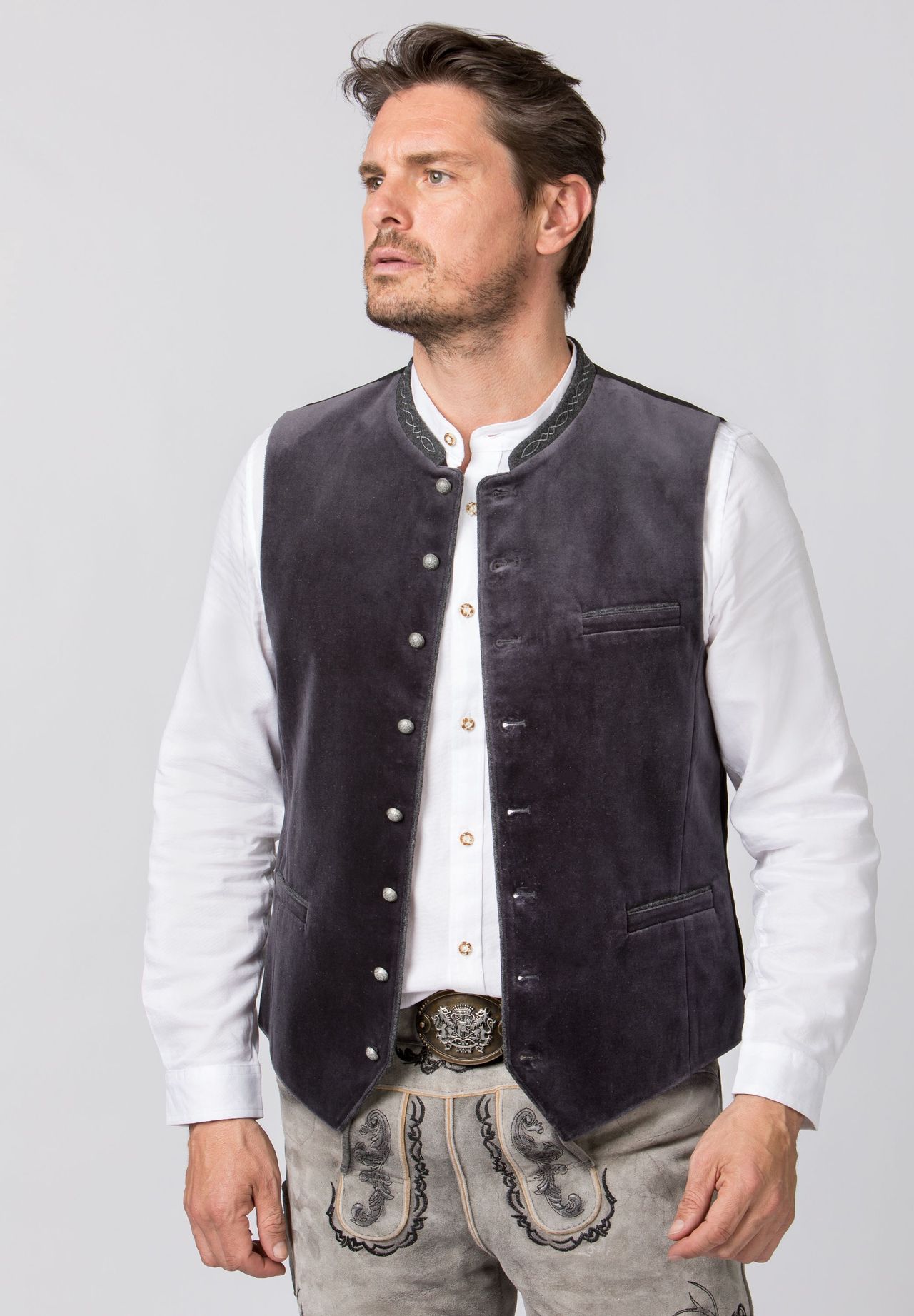 Традиционный жилет Лоренцо от Stockerpoint Classics. Классический жилет из высококачественного хлопкового бархата – это классика среди традиционных жилетов. Воротник-стойка выполнен из высококачественной ткани лоден с тонкой вышивкой и характеризует неповторимый стиль. Цветная окантовка подчеркивает традиционный дизайн. Классический прямой крой гарантирует очень хорошую и удобную посадку. Спинка выполнена из эксклюзивного жаккардового полотна в черную полоску и регулируется с помощью планки. Рельефные шариковые пуговицы из состаренного серебра искусно дополняют элегантный внешний вид. Традиционный жилет – идеальное сочетание с нашими традиционными рубашками и ледерхозенами. Все новое и в то же время часть дома.