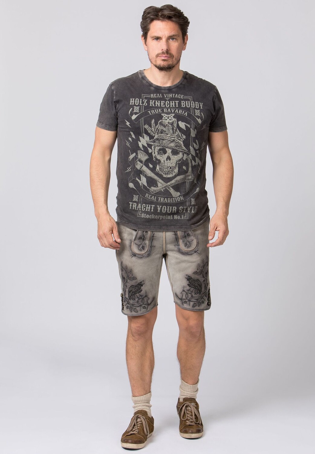 Футболка Buddy от Mountain Rocker антрацитового цвета. Традиционная рубашка комфортного покроя из высококачественного хлопка поражает модным принтом с надписью «Holz Knecht Buddy». Модный «потертый вид» придает стильный вид и идеально подчеркивает стильный дизайн. Искусно выполненный круглый вырез горловины также создает уникальный образ. Рубашку можно носить в повседневном стиле с кожаными брюками и джинсами, она станет незаменимым аксессуаром для крутых парней.