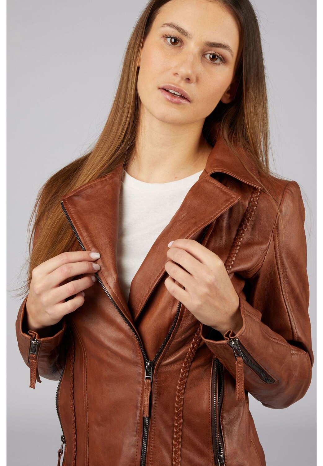 Эта модная кожаная куртка от 7 Eleven придаст вашему повседневному образу завершающий штрих. Декоративные швы и декоративная цепочка создают модные акценты. Он имеет современный и модный дизайн из кожи ягненка растительного дубления. Эта кожаная куртка дополнит ваш образ для отдыха. Номер модели:SEL-Jady7E