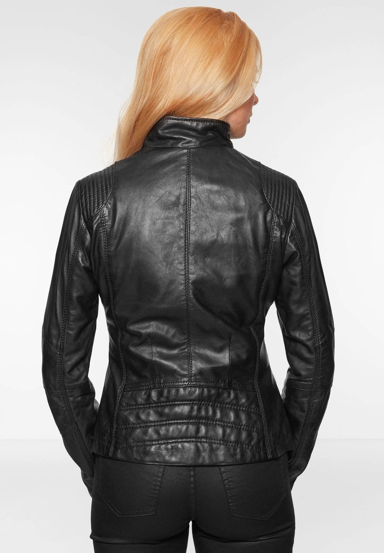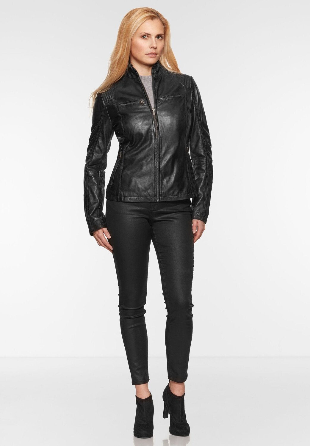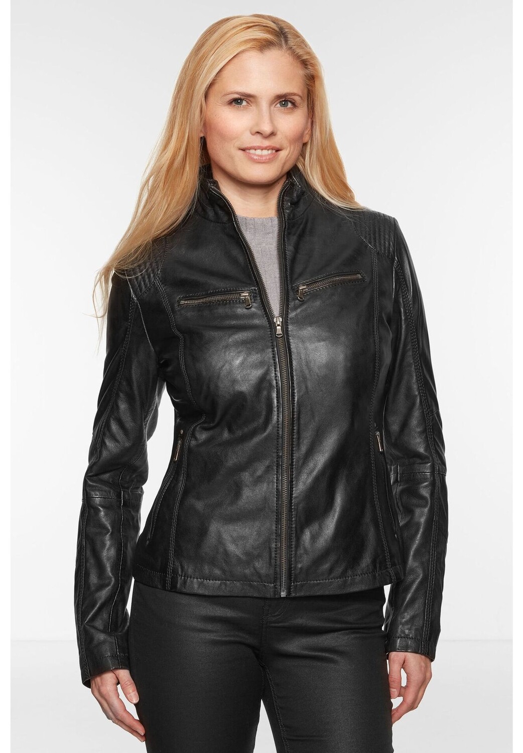 Эта модная кожаная куртка от 7ELEVEN изготовлена из высококачественной кожи ягненка наппа растительного дубления. Материал удивительно мягкий и в то же время прочный. Воротник-стойка, два нагрудных и боковых кармана, а также декоративная строчка в области плеч и спины придают спортивный вид. Слегка адаптированная форма и искусный крой обеспечивают идеальную посадку по фигуре. Номер модели: SEL-Jina7E