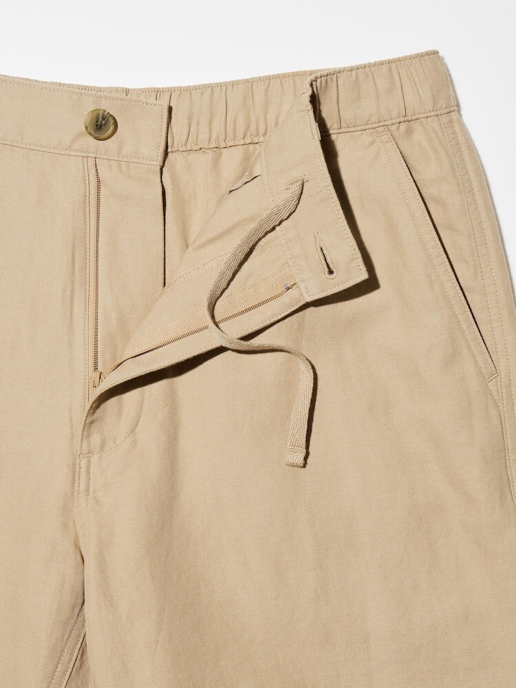 Бренд: Uniqlo Цвет: бежевый Прохладный и удобный, но при этом мягкий на ощупь. Свободный крой подчеркивает текстуру ткани. Материал саржевого переплетения премиум-класса сочетает в себе преимущества льна и хлопка. Характерная текстура льна с добавлением хлопка для мягкости на ощупь. Присборенный эластичный пояс для комфорта. Шнурок на талии из ткани в тон для высококачественной отделки. Накладные карманы сзади для повседневного образа. На представленных изображениях могут быть цвета, которых нет в наличии.