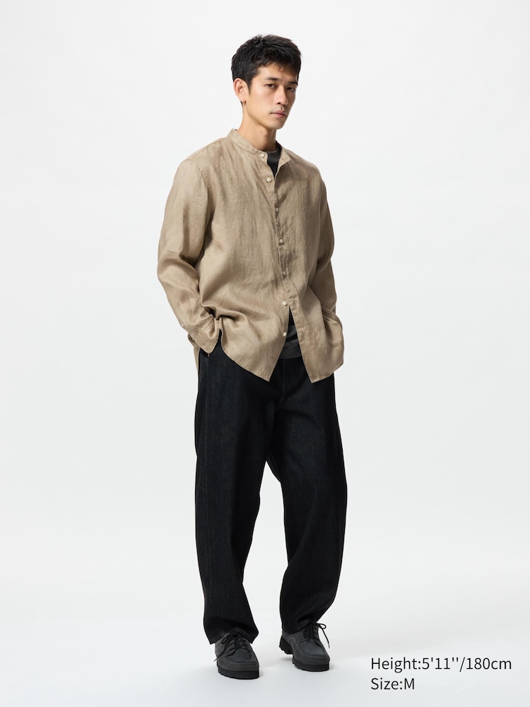 Рубашка из 100% льна, воротник-стойка Uniqlo, цвет 09 черный
