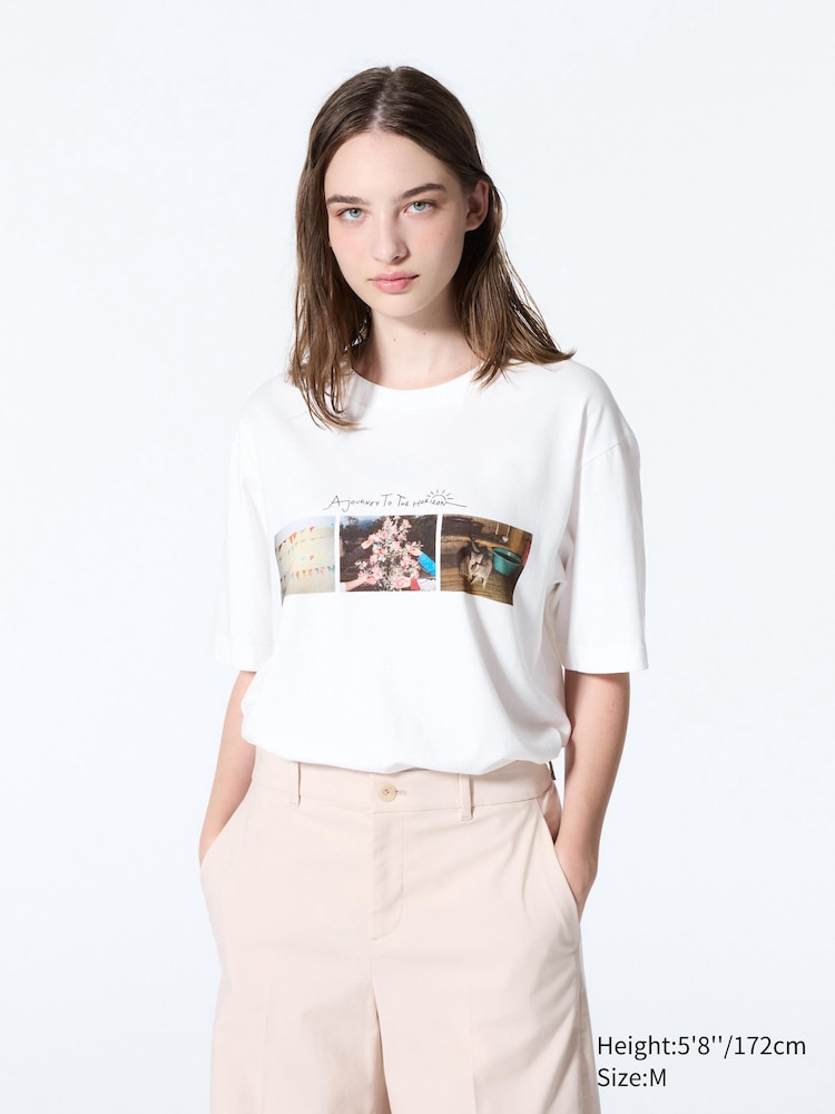 Белая футболка Uniqlo из коллекции Peace for All с графическим принтом от Magnum Photos. Часть средств от продажи направляется на поддержку мира.