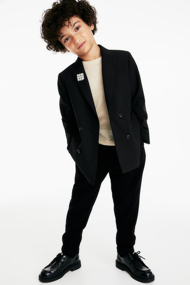 Двубортный пиджак из смесовой шерсти с острыми лацканами, нагрудным карманом, двумя прорезными карманами и внутренним карманом на пуговице. Декоративные пуговицы на рукавах и двойной разрез сзади. На подкладке.