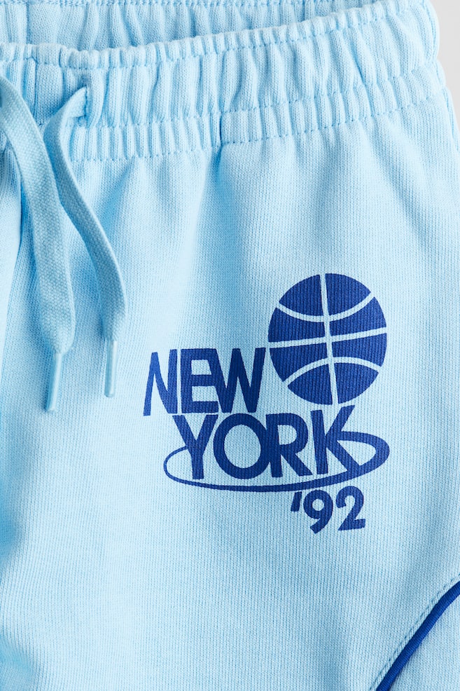 Спортивные брюки из легкой трикотажной ткани с рисунком на одной штанине. Эластичный пояс на шнурке, боковые карманы и окантовка на штанинах. Эластичные манжеты на штанинах.