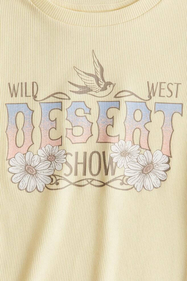 Топ из мягкого хлопкового трикотажа в рубчик с принтом спереди, круглым вырезом и короткими рукавами.