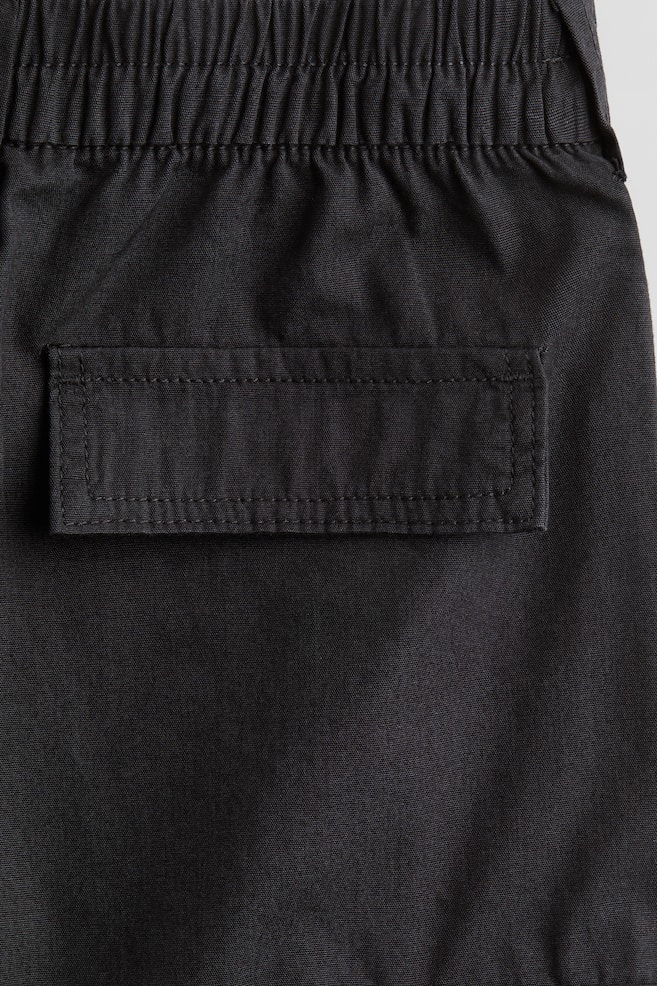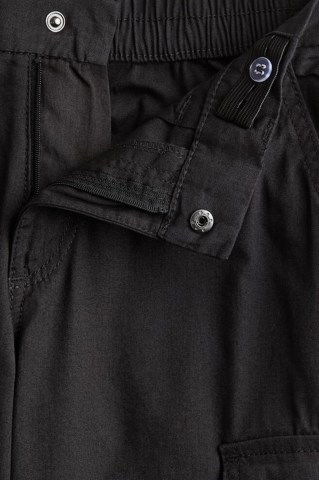 Брюки-карго из мягкой хлопчатобумажной ткани с карманами с клапанами на штанинах. Регулируемый эластичный пояс, застежка-молния с кнопками, боковые карманы и ложные карманы сзади. Широкие штанины.