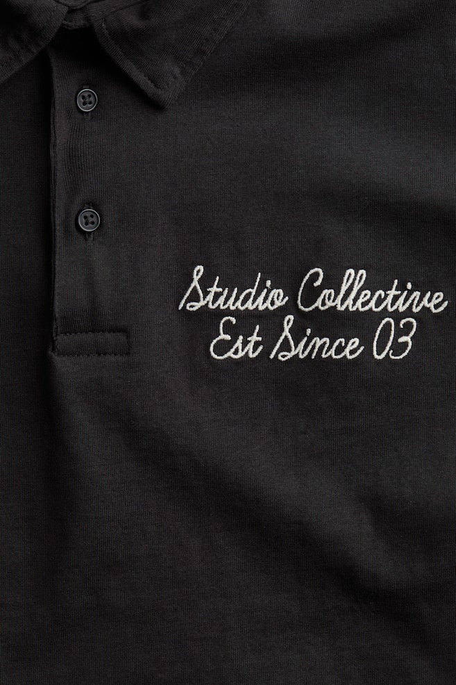 Футболка для регби из прочного хлопкового джерси. С воротником, короткой планкой на пуговицах, спущенной линией плеча и длинными рукавами с ребристыми манжетами. Короткие боковые разрезы на подоле.
