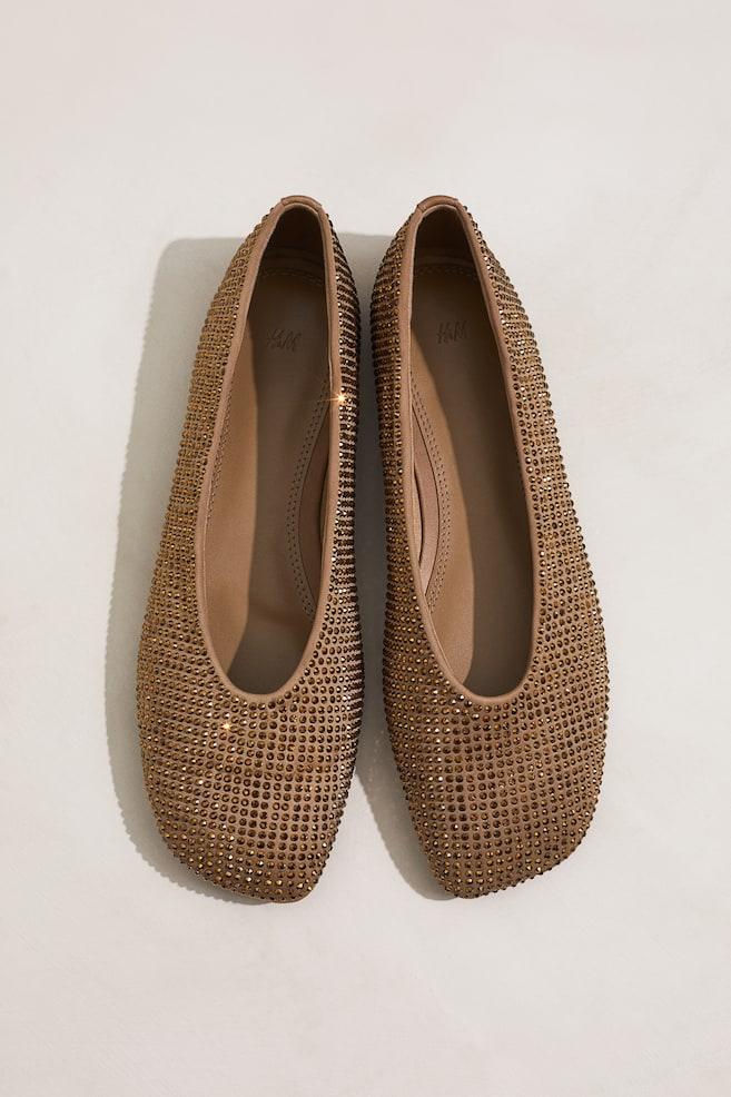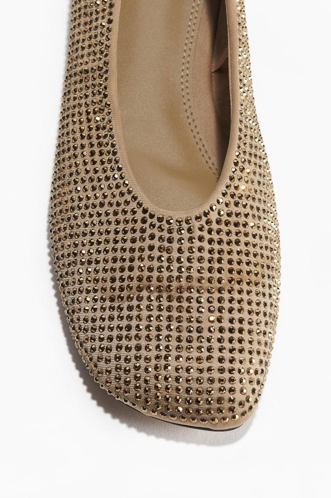 Балетки из блестящего трикотажа, украшенные сверкающими стразами. Слегка закругленный кончик. Подкладка из атласа.